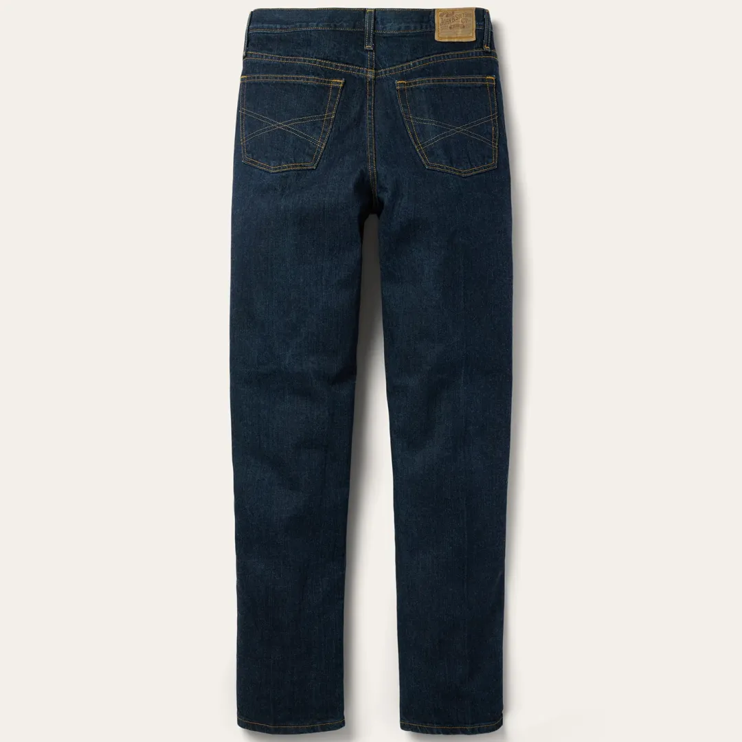 The 1520 Fit Standard Straight Leg jeans are crafted from high-quality 100% cotton denim with a dark wash. The 5-pocket style is cut with a mid rise, the leg is relaxed through the thigh, with a bootleg opening. Additional features include a button fly with Stetson branded buttons, contrast top stitching and decorative “X” seaming on the back pockets. Made to last and built to be broken in, this is quality denim you can rely on.