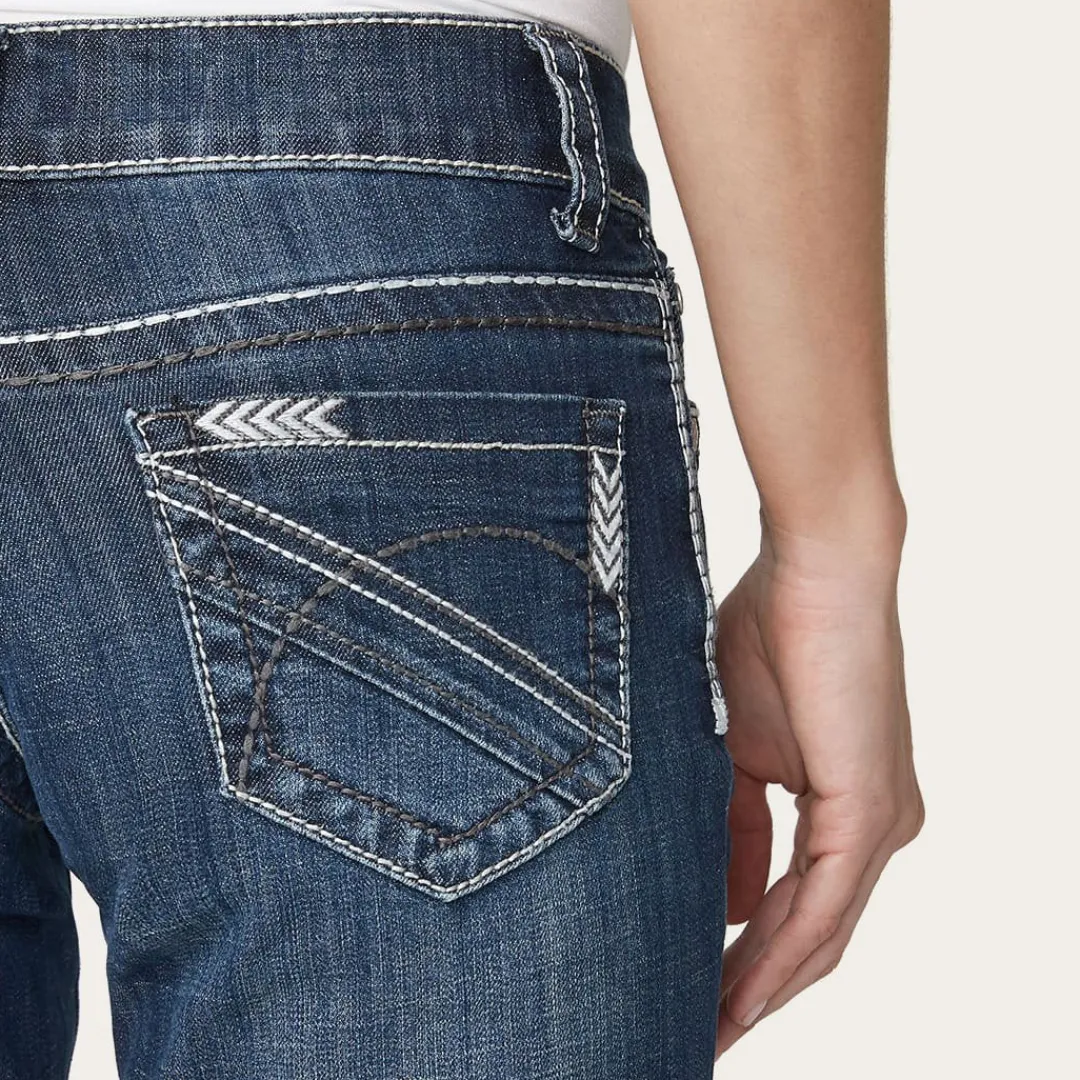 Details include chevron-detailed back pockets and a lightly hand-sanded fade for the perfect worn-in feel. The complete look is finished off with custom Stetson-branded hardware. Designed to look great, fit right, and work hard, the careful styling of these Western jeans is made for women with an independent spirit and love of heritage craftsmanship.