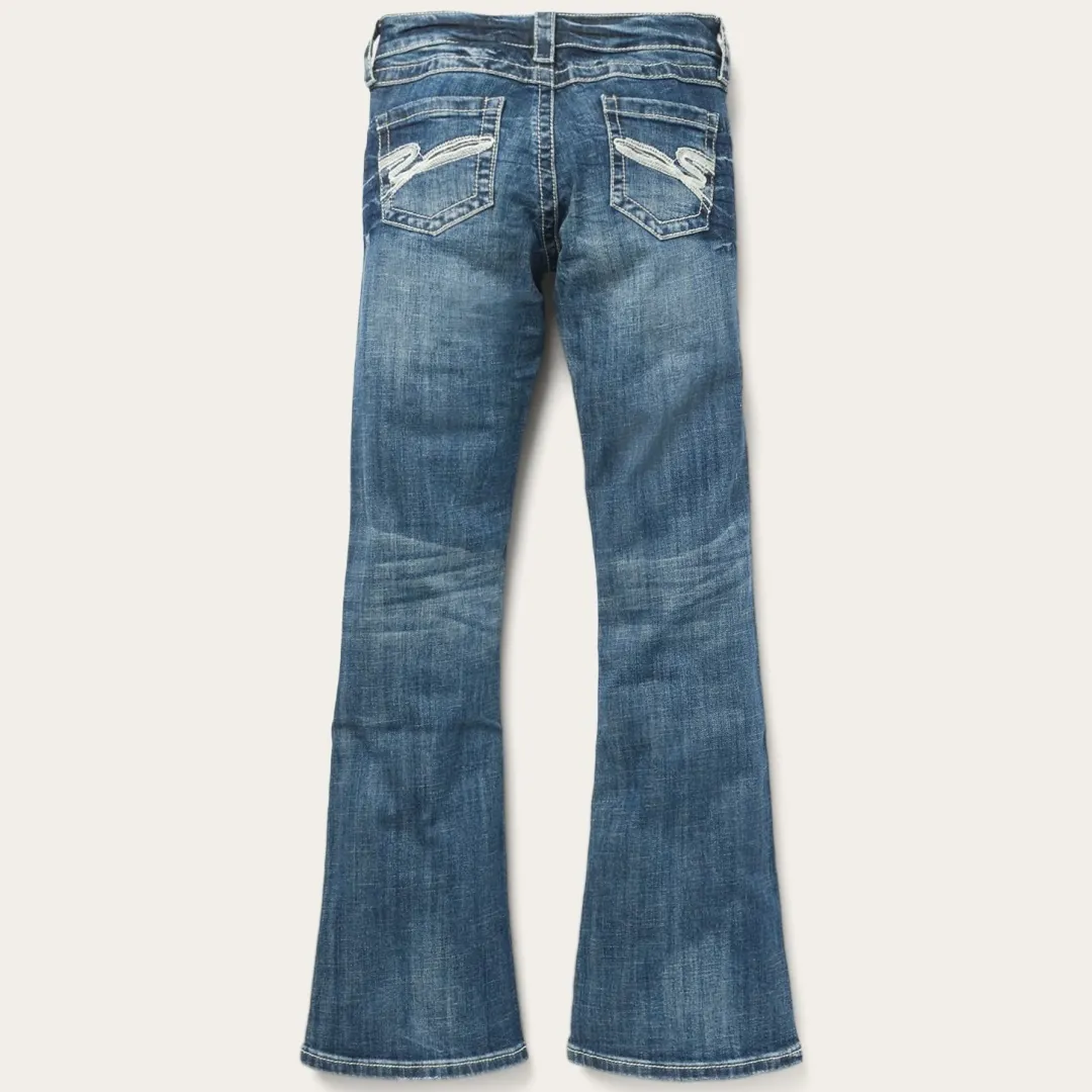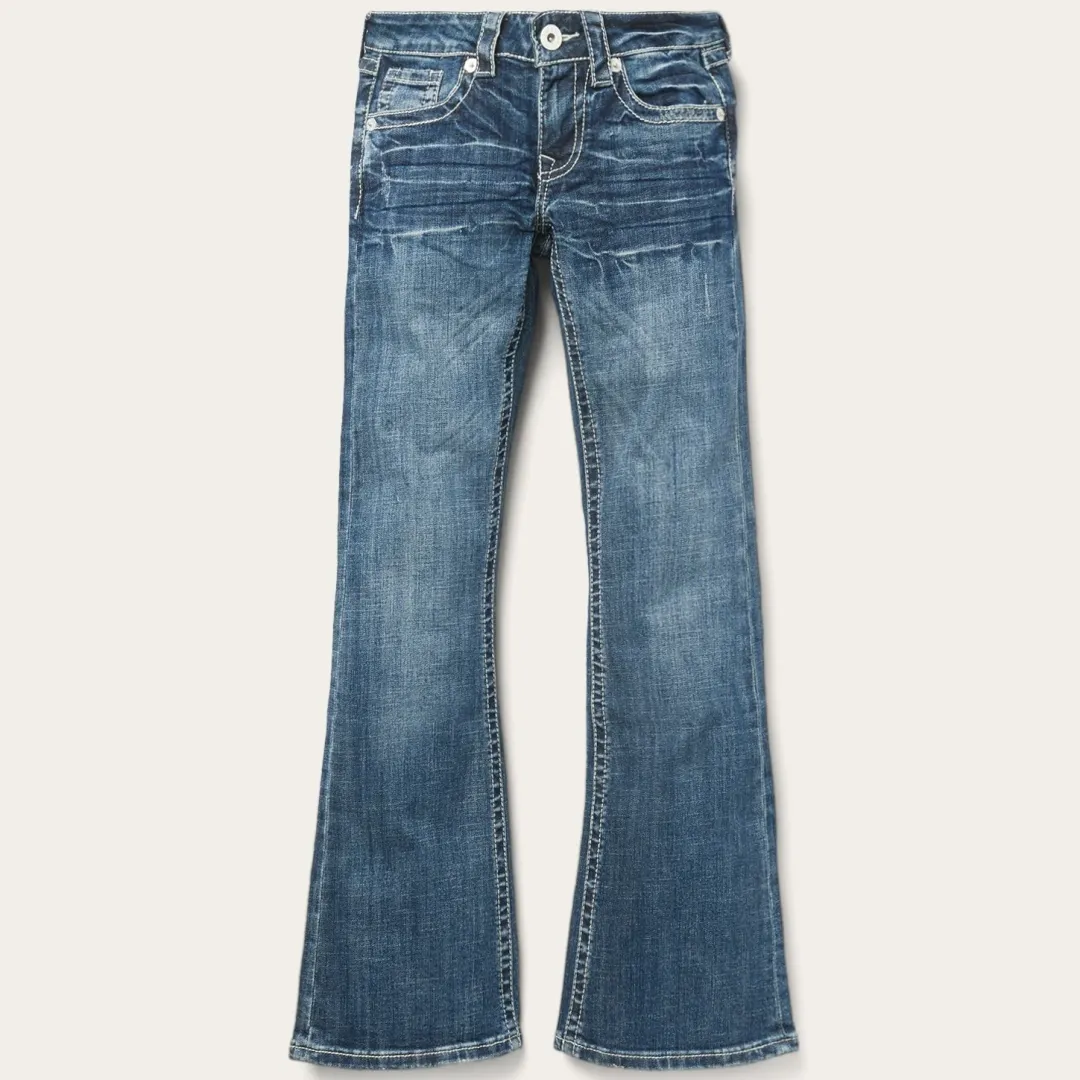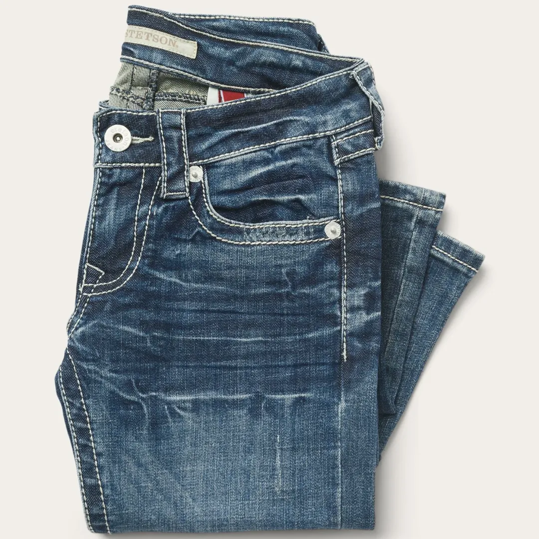 Details include subtle back pockets, whiskers, and a lightly hand-sanded fade for the perfect worn-in feel. The complete look is finished off with custom Stetson-branded hardware. Designed to look great, fit right, and work hard, the careful styling of these Western jeans is made for women with an independent spirit and love of heritage craftsmanship.