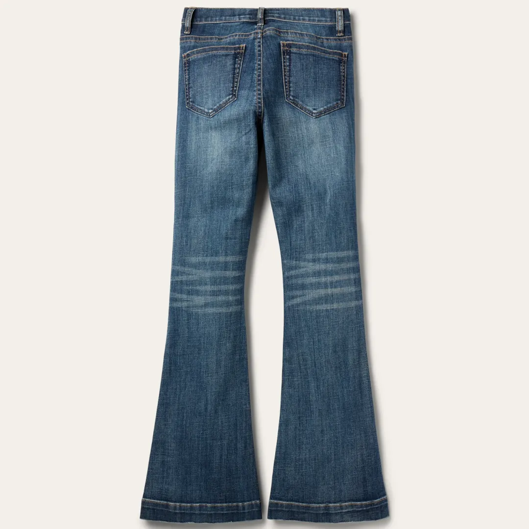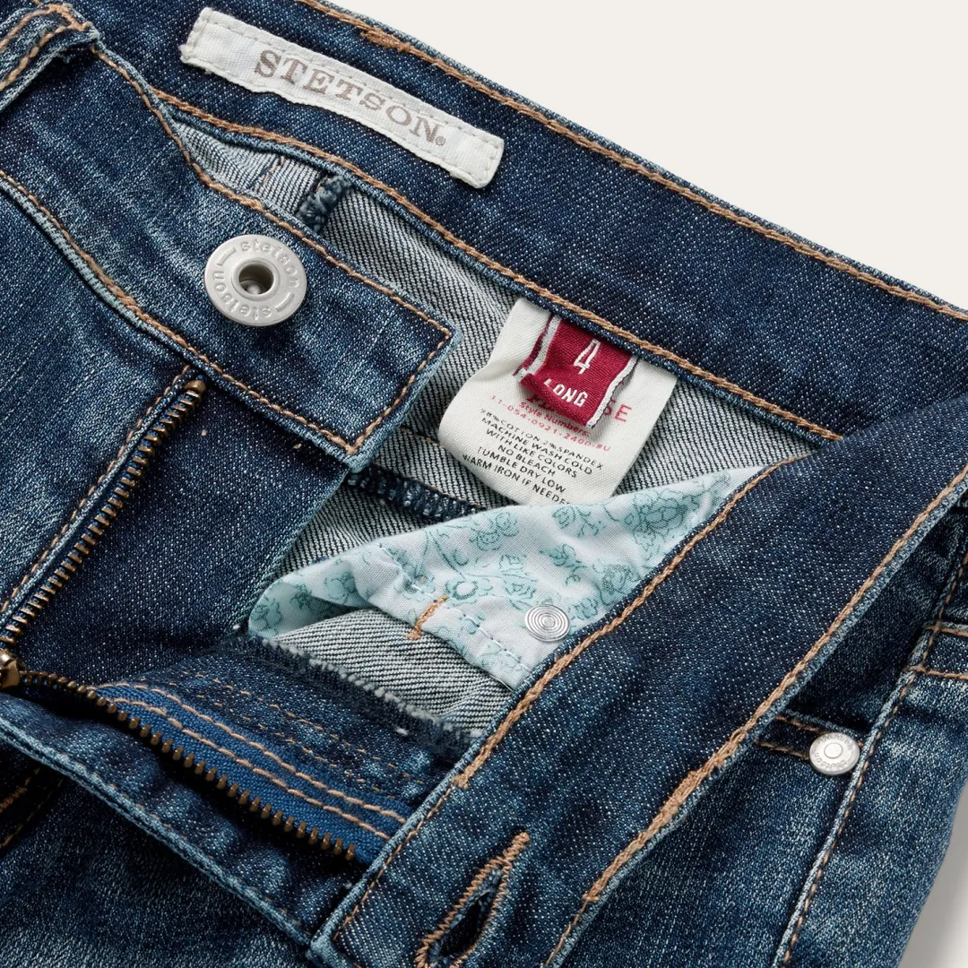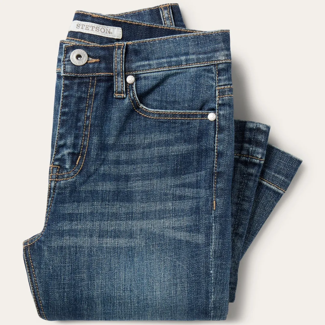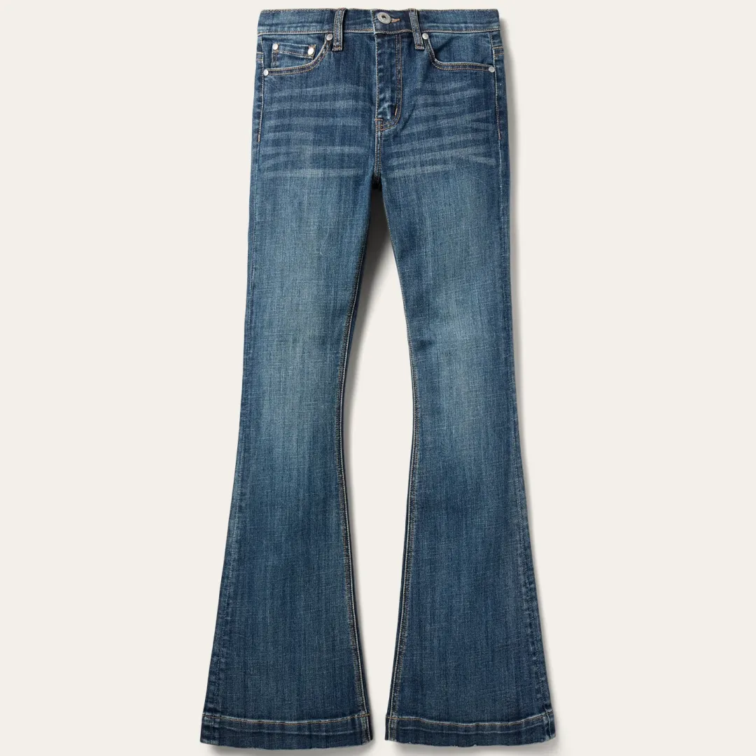 These 921 High Rise Flare jeans are crafted from durable cotton denim with just enough stretch for ease and comfort. Featuring a slim fit through the thigh and knee with a dramatic flare leg opening, the classic five pocket style features a plain back pocket, and Stetson branded buttons, rivets, and zipper. Finishing touches, like gentle sanding and whisker details, complete the jeans for that perfect lived-in look.