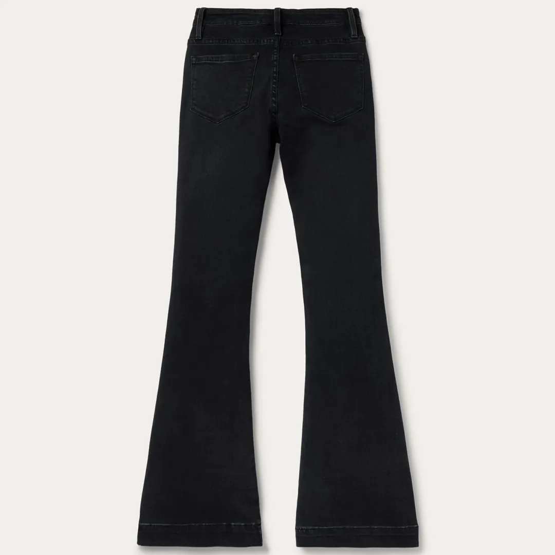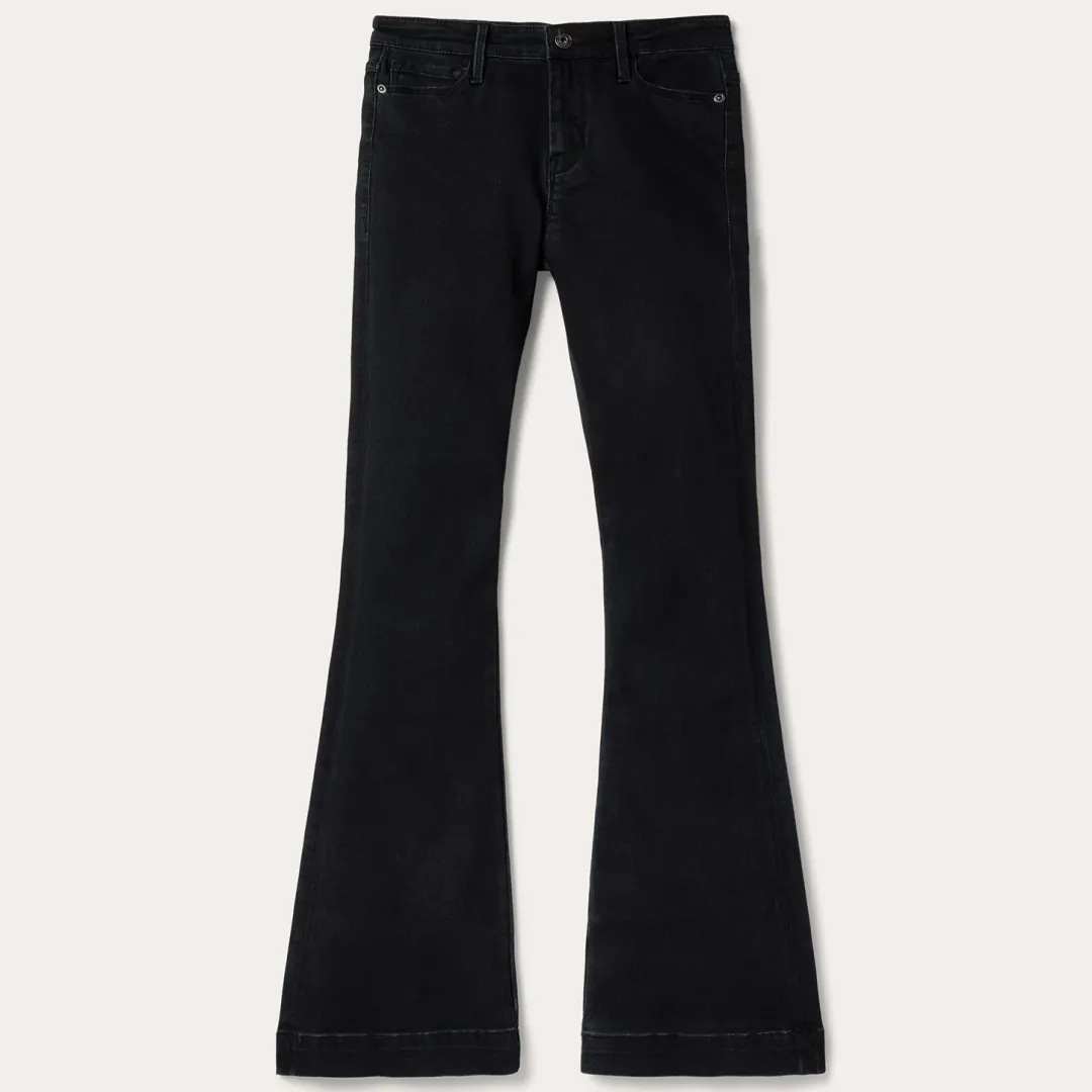 These 921 High Rise Flare Jeans are crafted from black cotton denim with just enough stretch for comfort and ease of movement. Designed to sit at the natural waist, they have a slim fit through the thigh and knee that flares out into a stylish bootcut leg opening. The classic 5-pocket style features plain back pockets and Stetson branded buttons, rivets, and zipper. Subtle sanding details complete the jeans for a perfect lived-in look.