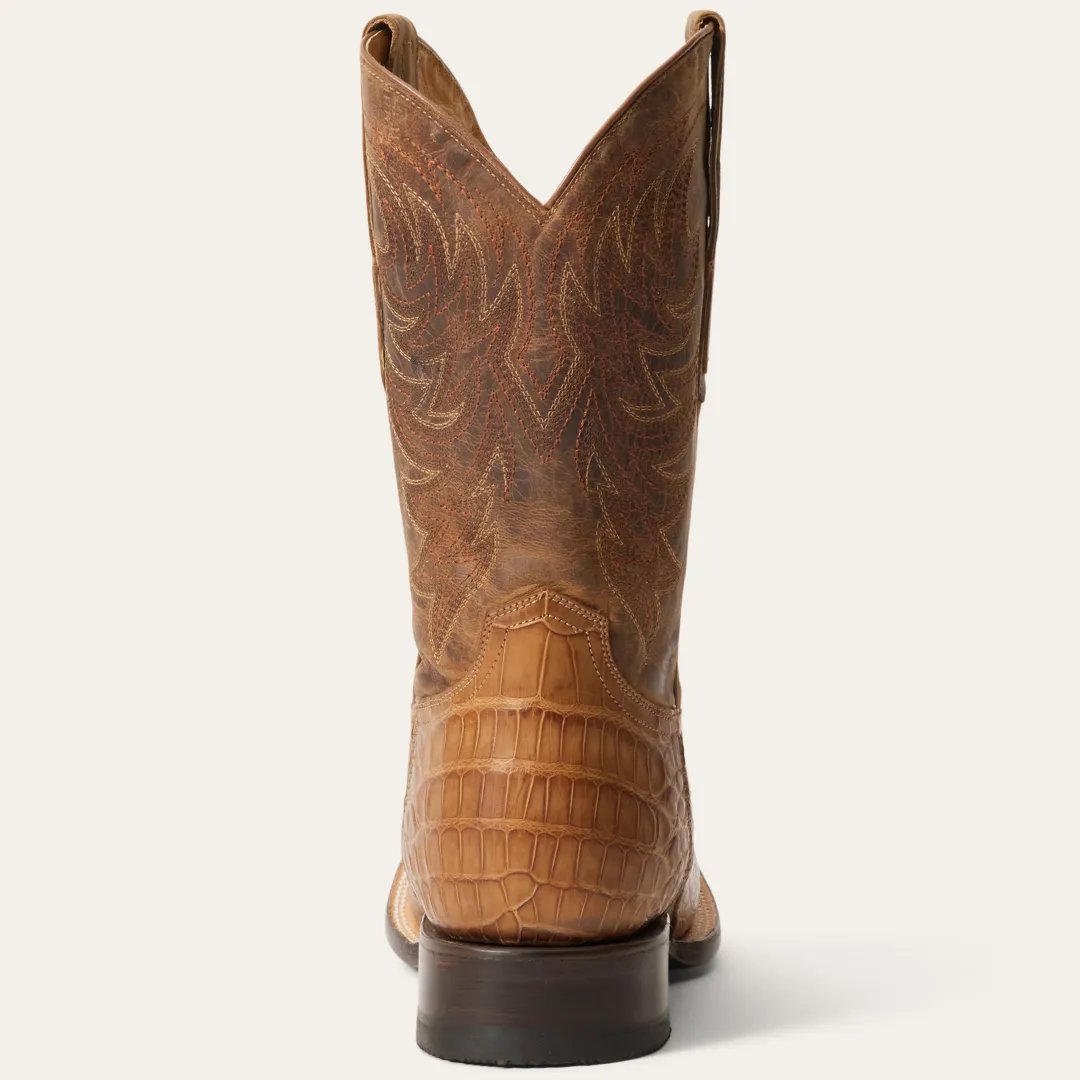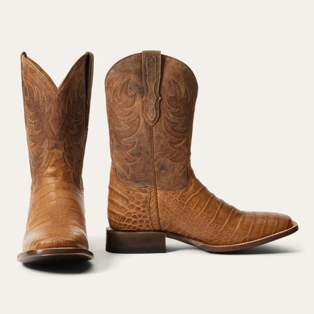 The Aces Alligator Boots have a square toe, an Premium Oiled Alligator Leather Vamp and an 11″ oiled brown leather shaft. Additional features include premium leather lining, removable Tru-X insoles, premium brass nails and hand-driven lemonwood pegs that enable the boot to withstand the elements by expanding and contracting with any moisture the boot may encounter.Our exotic western boots are handcrafted with the same care and consideration that goes into our legendary headwear, resulting in the ultimate mix of heel-to-toe comfort, durability, and classic Western style. Their rugged construction is fit for a lifetime of adventure, with high-quality exotic leathers that will develop an attractive patina over time and conform to the wearer, providing years of reliable service.