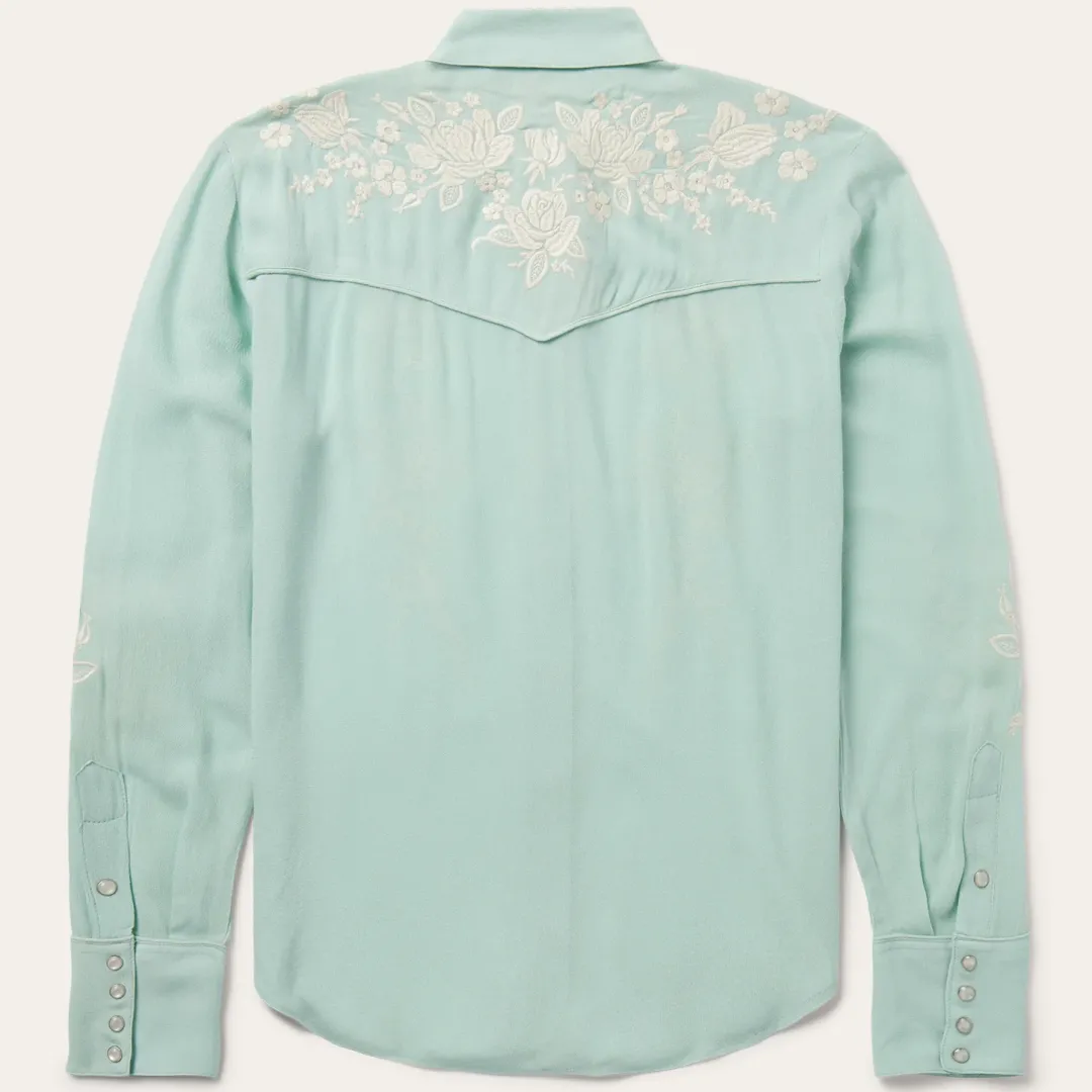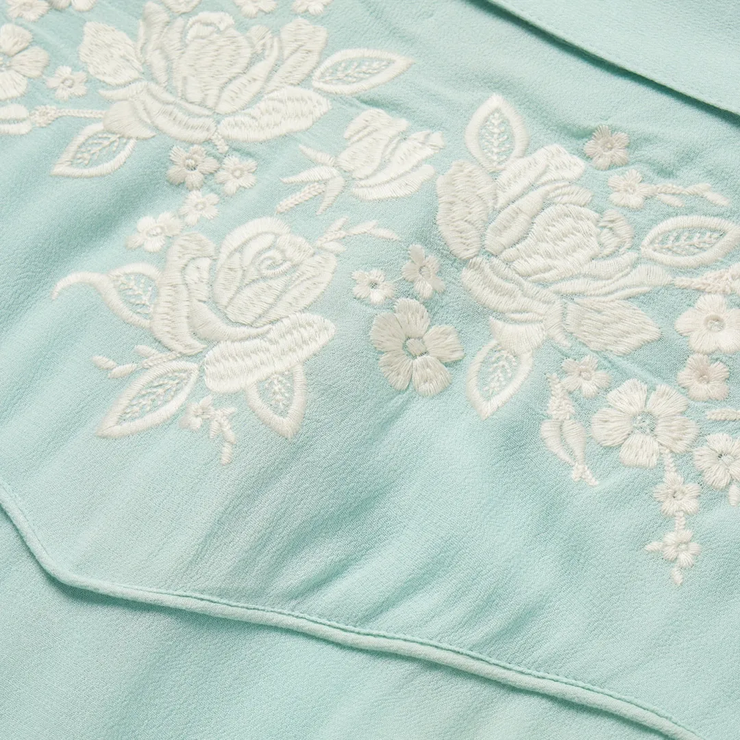 This stylish western-inspired blouse is crafted from soft 100% rayon crepe. It has a single point curved front yoke and deep back yoke, along with an eye-catching floral embroidered detail and self-piping. Cut with an easy, flattering drape, the blouse allows for all-day comfort and freedom of movement.
