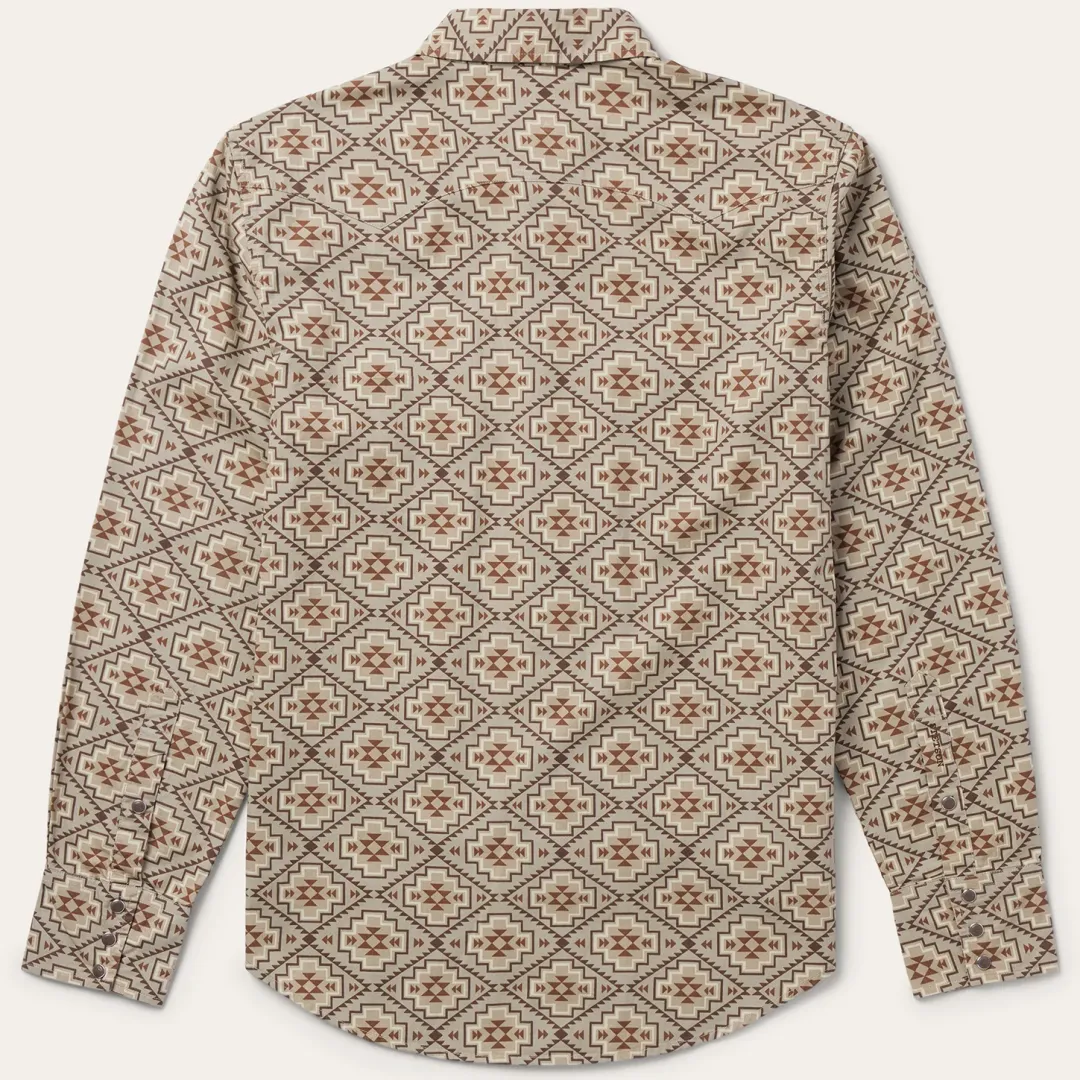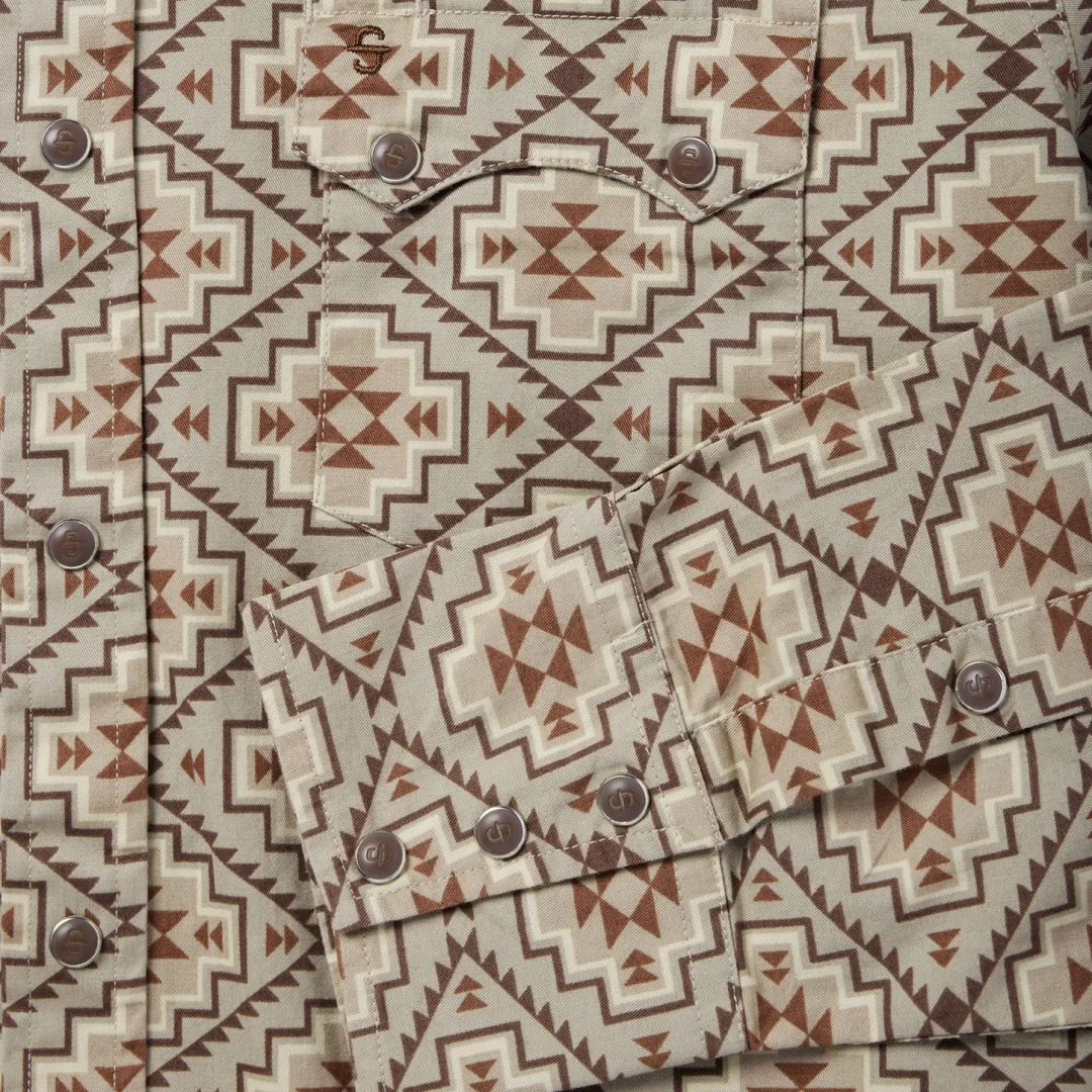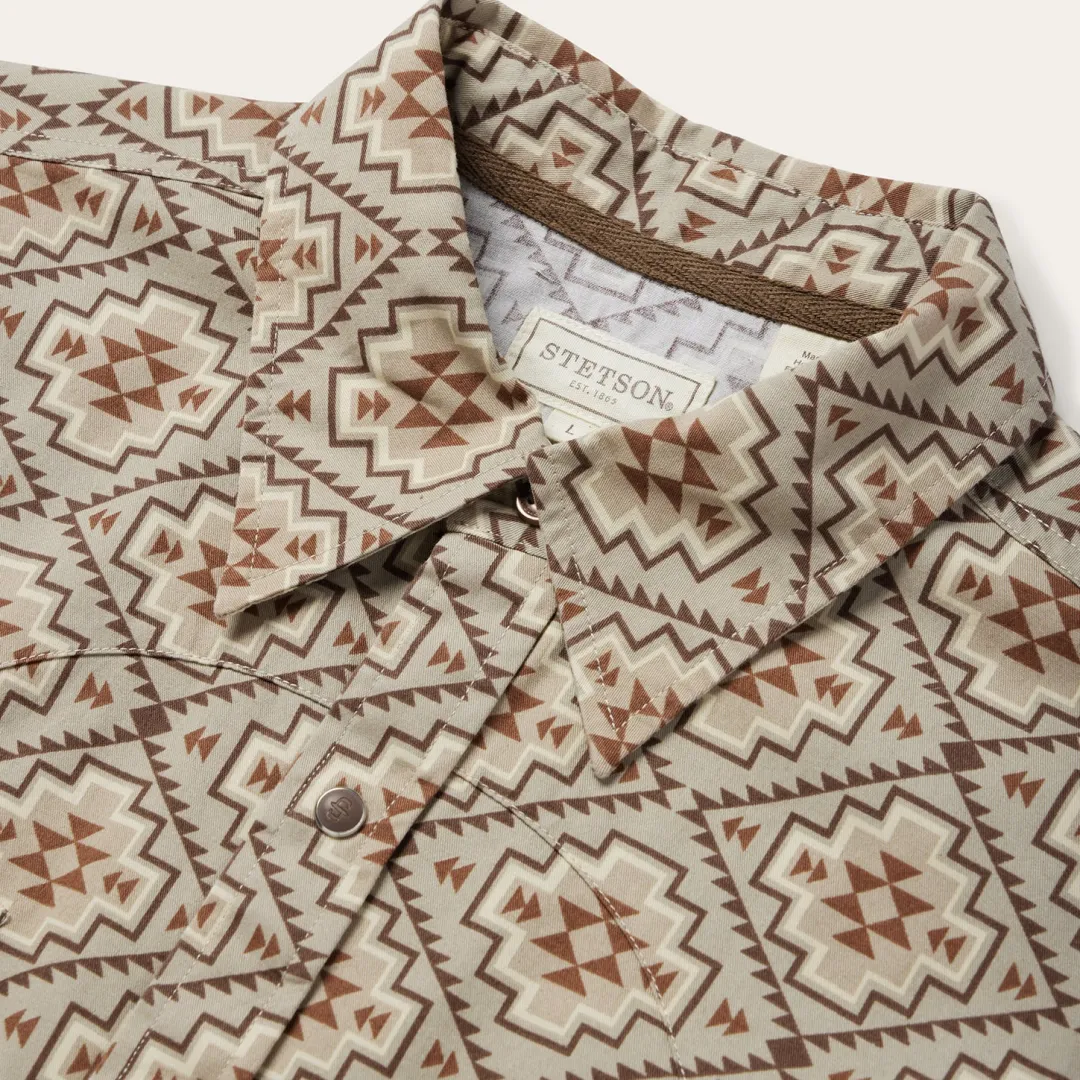 We set the standard for snap fronts. They’re not just Western-inspired, they’re imbued with a Western spirit. This modern fit shirt is crafted from crisp, breathable 100% cotton poplin that has been yarn-dyed for rich, lasting color and made to get better with age and wear. Featuring our exclusive all-over brown aztec print, it has a two-point curved back yoke, two-point curved pocket flaps, twill tape inside trim, subtle “S” and “Stetson” embroidery at the chest and right sleeve placket, a three-snap cuff and a classic snap front featuring opaque logo snaps.