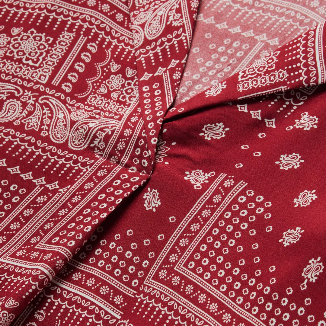 This pullover blouse is crafted from soft, smooth 100% rayon and features a Western-inspired allover Red Bandana Patchwork print. It has a flattering open notch collar V-neck and long sleeves with a slight bell. The large pleat at the center front creates a slimming effect, while the relaxed fit and lightweight fabric ensure all-day comfort and freedom of movement.