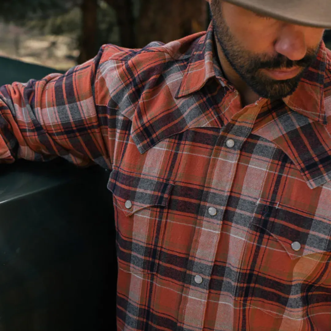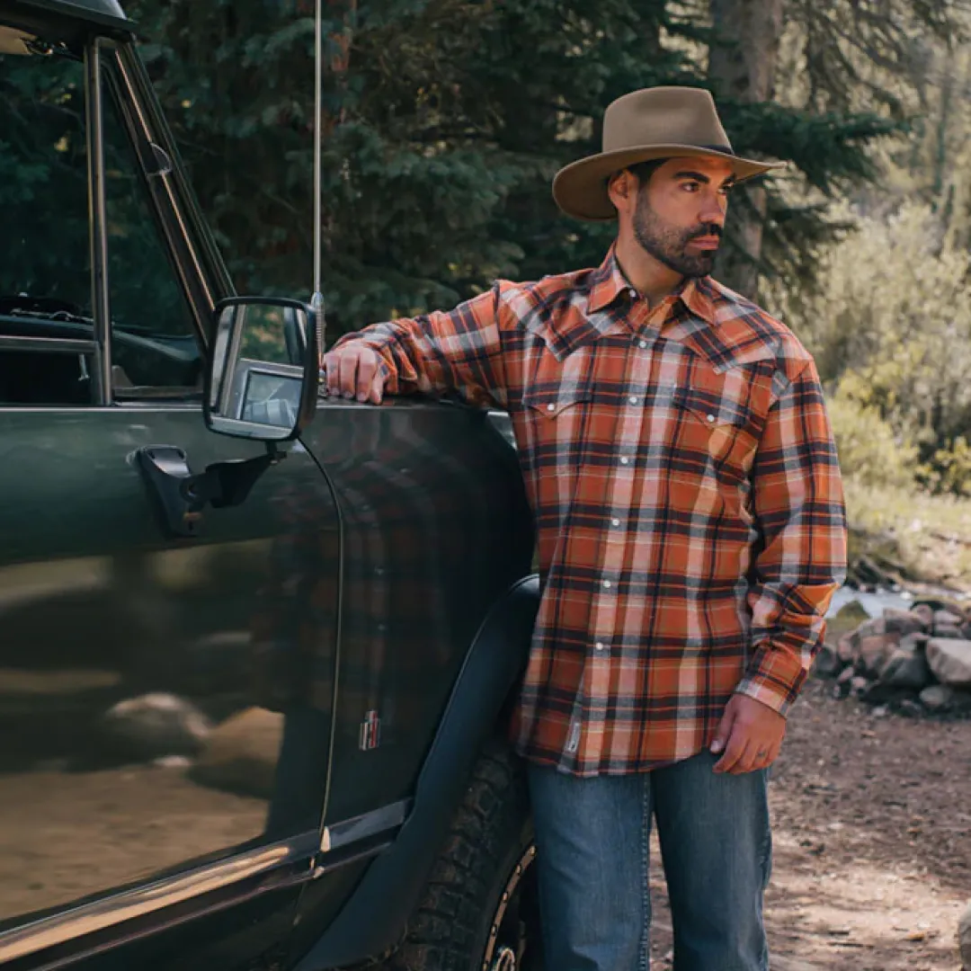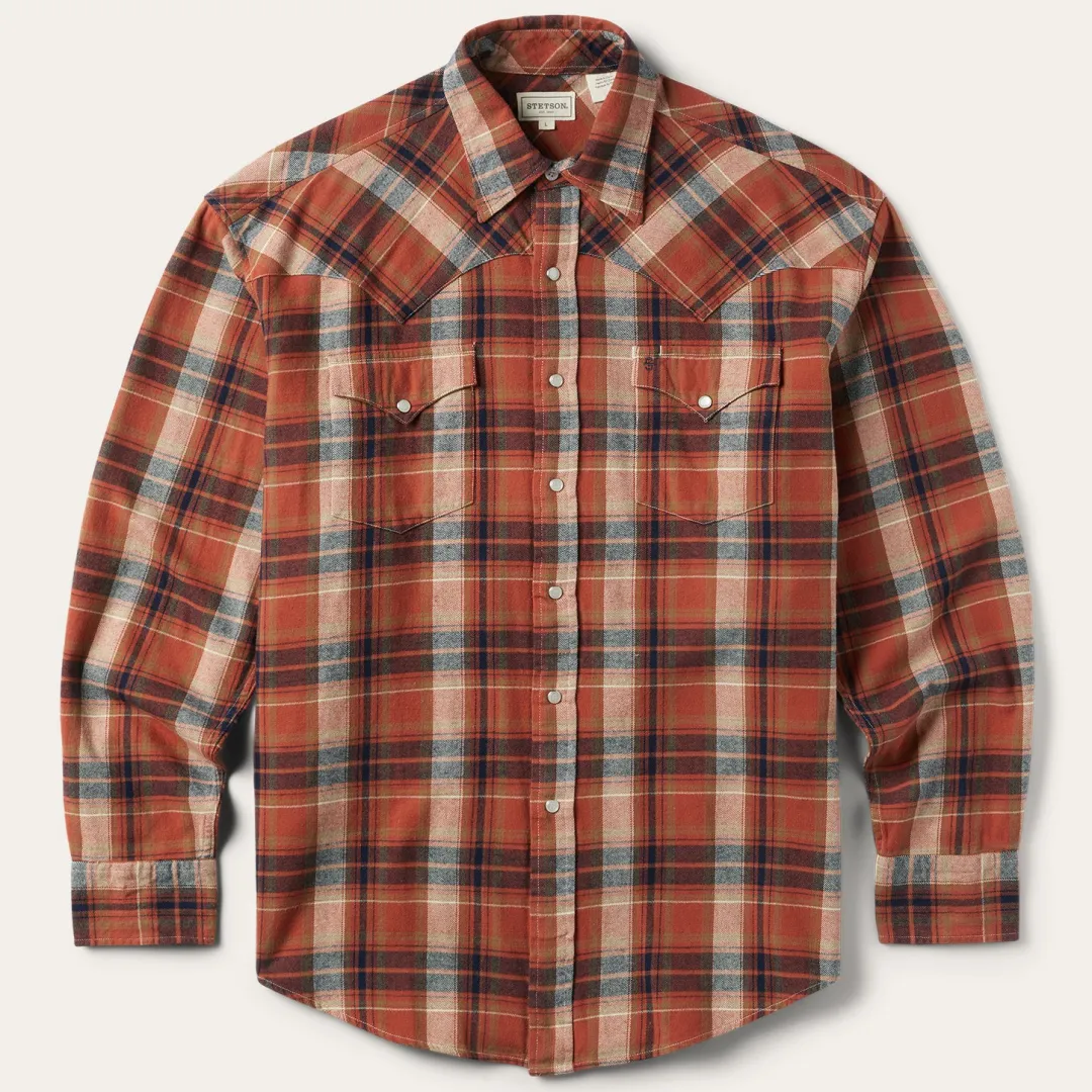 This rugged flannel shirt features an exclusive sunset orange plaid print. Authentic Western details include a snap front, one-point curved back yoke and a three snap cuff. A spread collar with collar stays keeps the shirt looking sharp, while subtly embossed Stetson logos on the chest pocket and sleeve placket further augment the style. It’s made from a garment washed brushed twill flannel that hangs well while keeping its shape and only gets better with age.