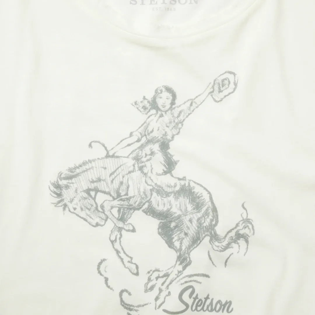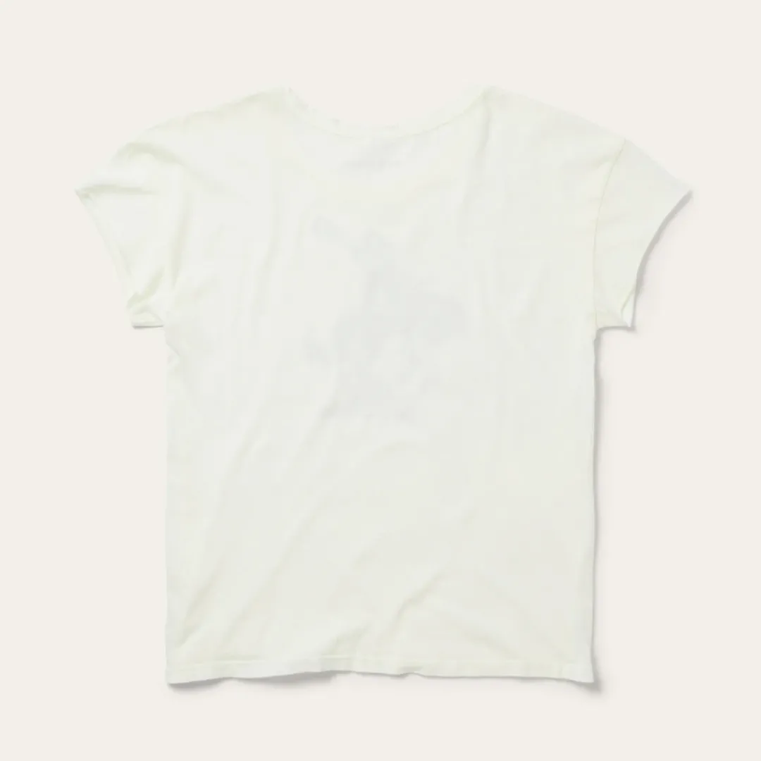 With easy style and maximum comfort, our graphic tees are made from airy 100% cotton and screen-printed with custom signature graphics. This vintage-inspired white tee has been gently distressed and garment washed, giving it the perfect worn-in look and feel. It features slight drop shoulders, raw edge short sleeves and a transparent charcoal-colored bucking cowgirl print.