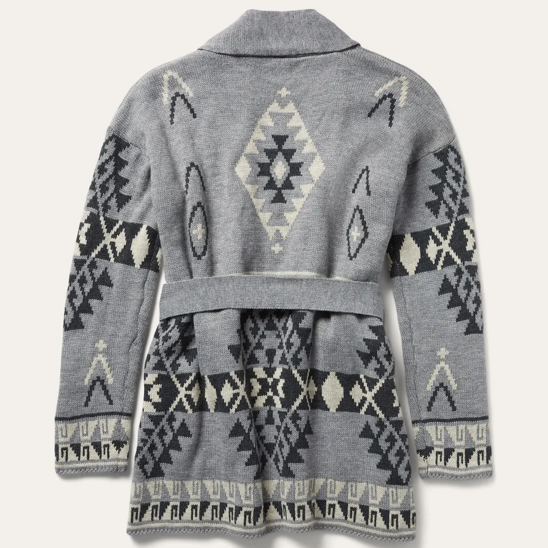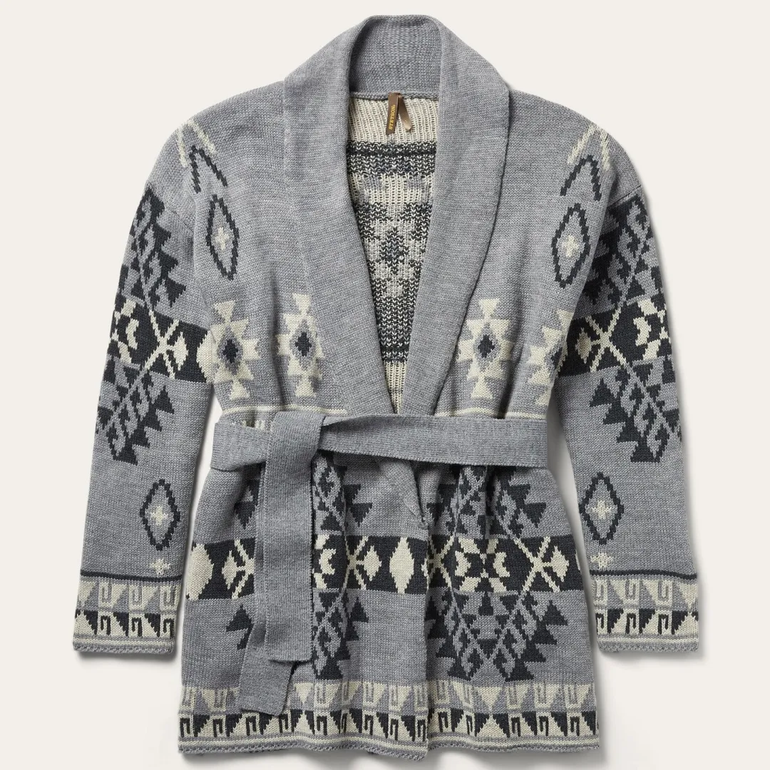 Ultra-plush, this chunky-knit shawl collared southwestern print sweater is dependable for warmth and comfort. Versatile and flattering, this piece can be belted or buttoned over your favorite jeans for a polished winter look.