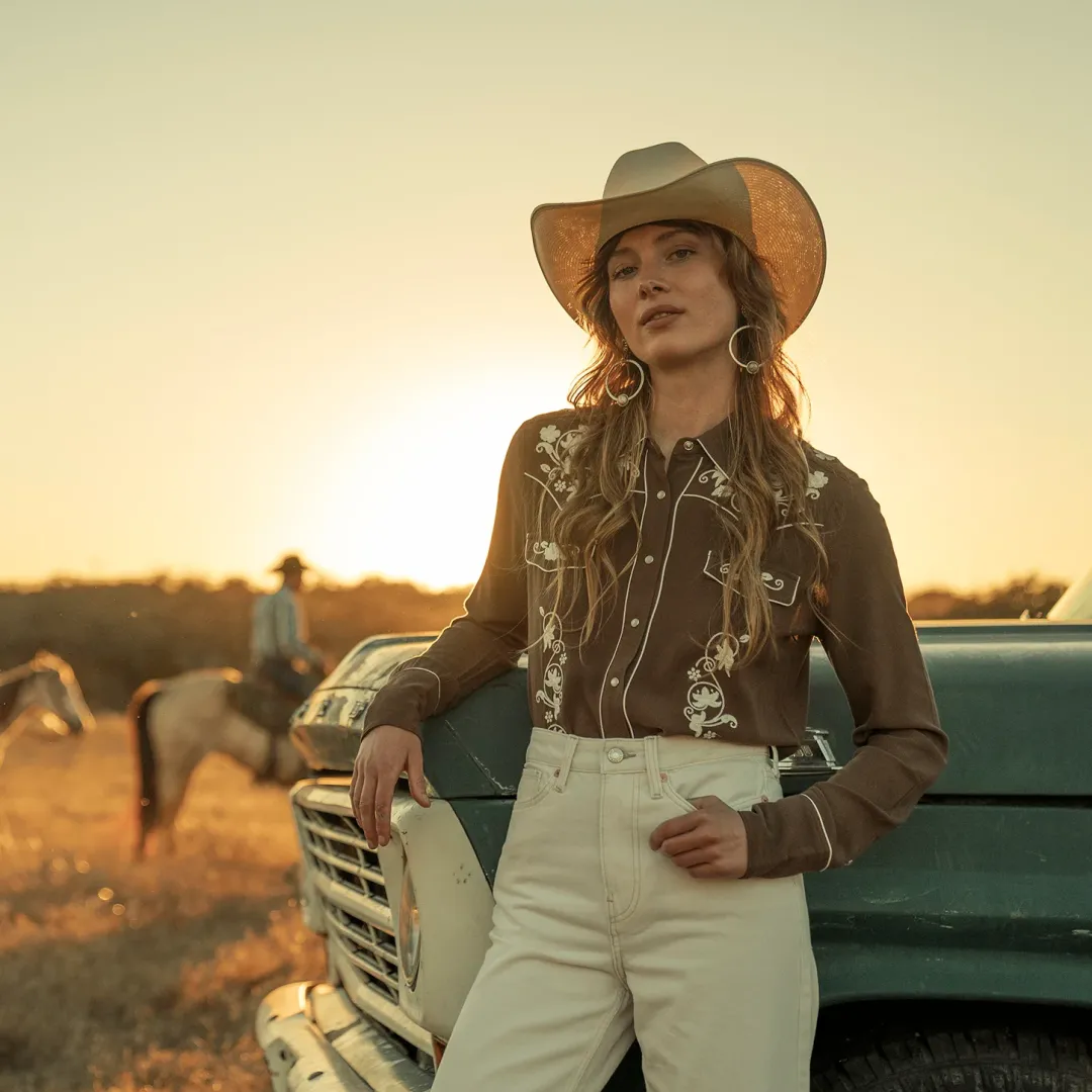 This snap-front western shirt offers classic style with heritage details like contrast piping and embroidery. It’s constructed with extremely soft rayon crepe and features a single-point front and back yoke, an oversized collar with piping, and smile pockets. This shirt is equally at home out on the ranch or out on the town.