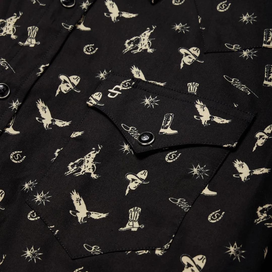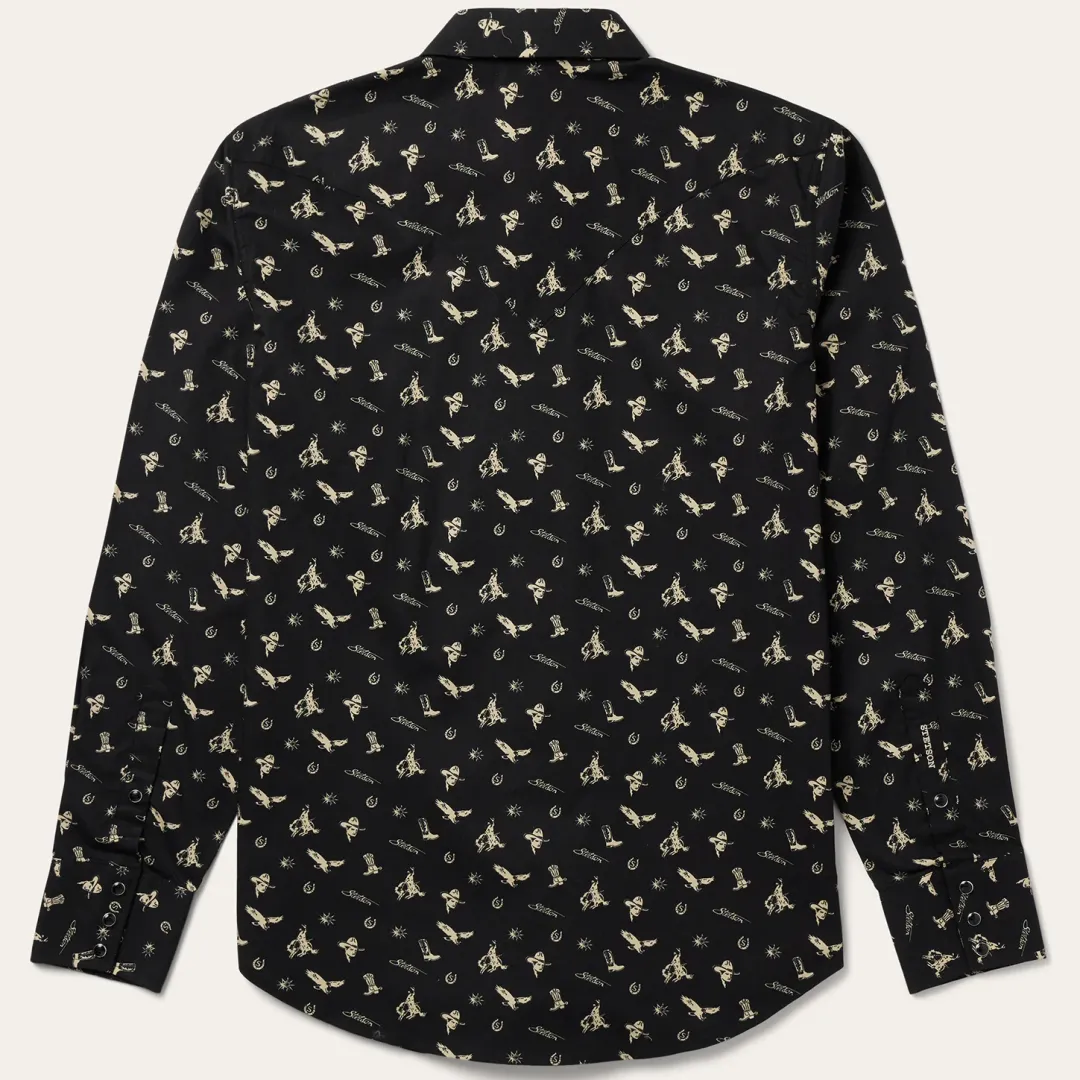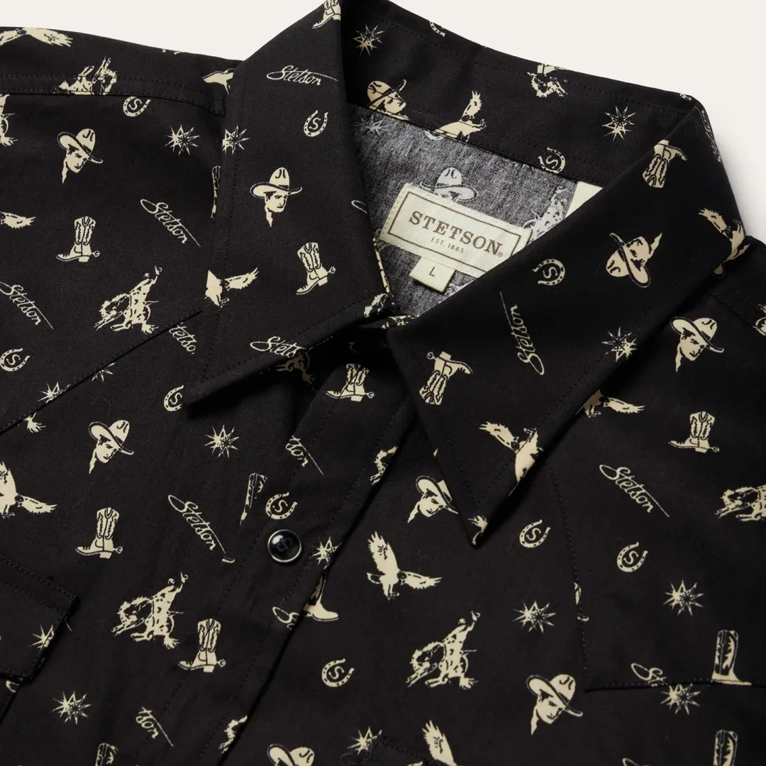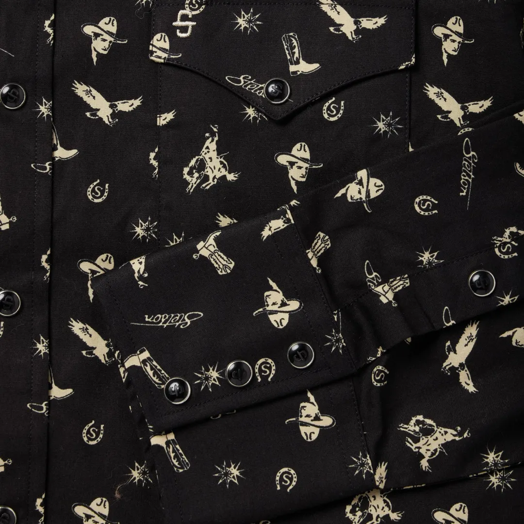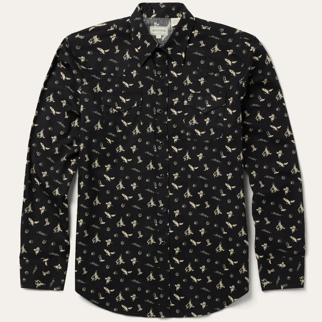 We set the standard for snap fronts. They’re not just Western-inspired, they’re imbued with a Western spirit. This modern fit shirt is crafted from crisp, breathable 100% cotton poplin that has been yarn-dyed for rich, lasting color and made to get better with age and wear. Featuring an exclusive “conversational” print of nostalgic cowboy motifs, it has a one-point, ultra-deep curved back yoke, subtle “S” and “Stetson” embroidery at the chest and right sleeve placket, a three-snap cuff and a classic snap front featuring pearl logo snaps.