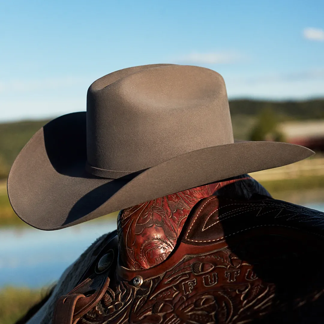 Part of our Buffalo collection, this cowboy hat is made in the USA of high-quality, weather-resistant 4X buffalo felt. Its classic Western profile features a classic cattleman crease, a 4″ brim and a 4 1/2” regular oval crown. Additional details include a leather sweatband, satin lining, and a self-matching hat band with a three-piece silver-toned buckle set, as well as a Stetson hat box.
