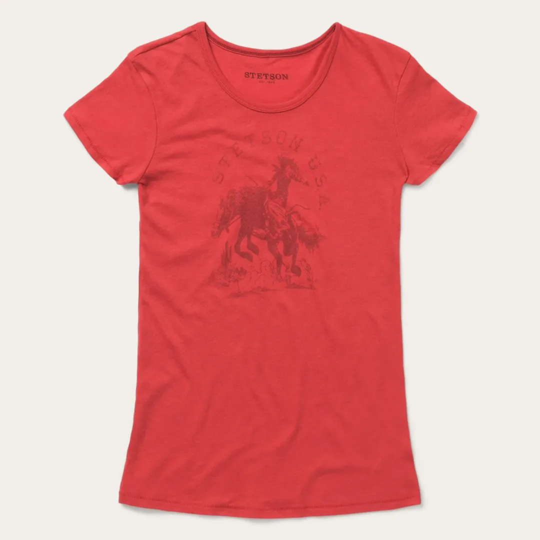 Nothing says good times like the relaxed feel of a graphic tee. Designed for maximum comfort without sacrificing an ounce of style, our t-shirts are made from airy cotton and screen-printed with custom signature graphics. This Western Stetson tee has been gently distressed, providing the perfect worn-in look for the spirited cowgirl. Go casual with a pair of jeans and boots, or dress things up with a skirt and sandals — however you decide to wear it, this shirt will see you through your day and then some. Extra soft and cut with the perfect slim fit, it’s an instant classic.