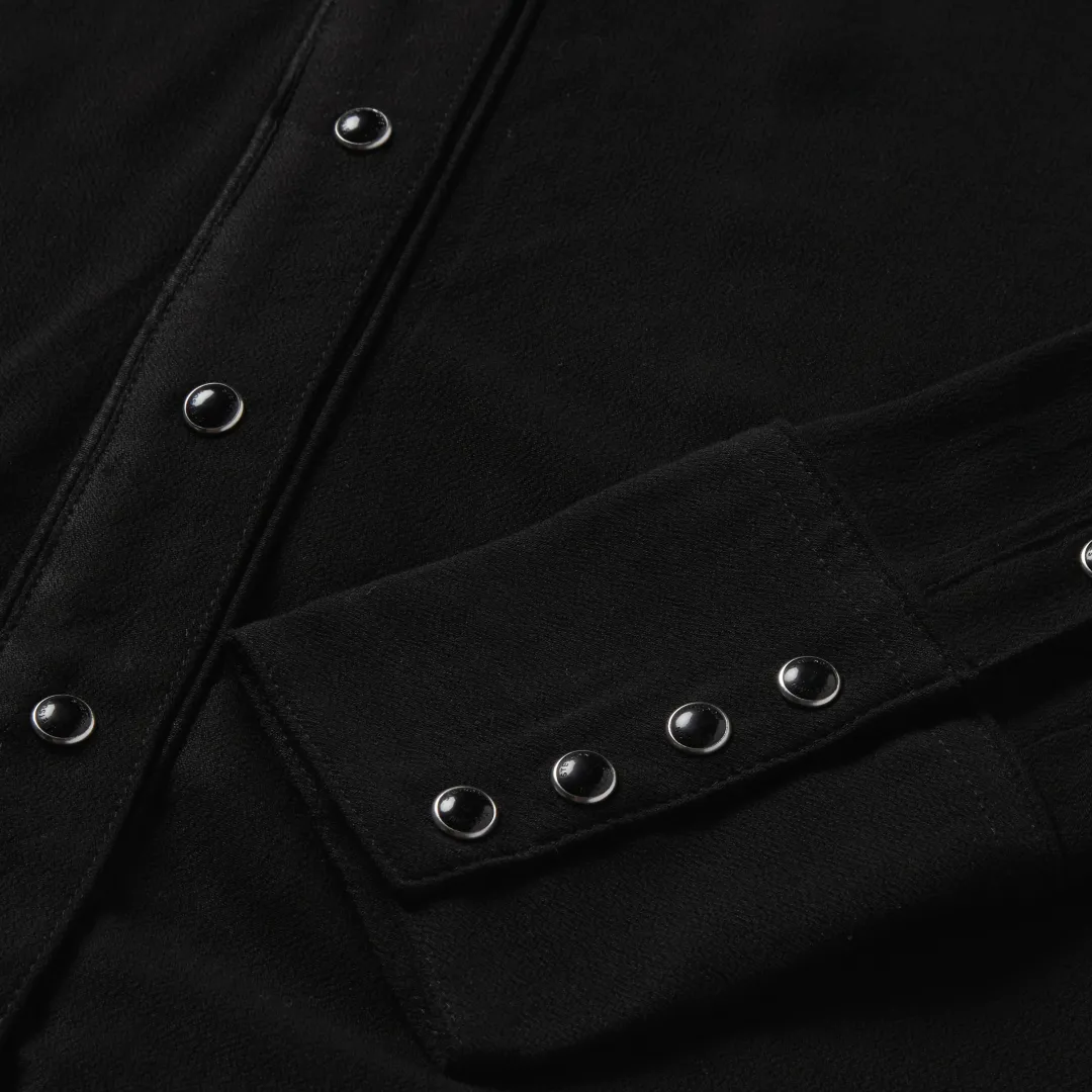This long-sleeve black Western blouse is crafted from soft, smooth 100% rayon and features eye-catching floral embroidery. It features tonal piping on its oversized collar, single point front and back yokes, front placket and cuffs and contrast piping on its two smile pockets. Lightweight and breathable, it has an easy, elegant drape and a flattering, flowing fit that allows for freedom of movement.