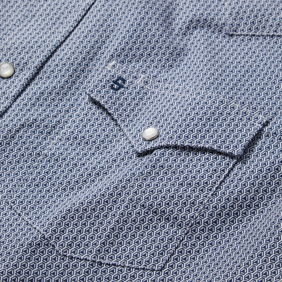 This Western shirt is crafted from a lightweight cotton poplin with a Blue Deco Geo allover print. It features a one-point curved back yoke, snap front featuring logo pearl snaps, and three snap cuffs. The front left pocket is adorned with the Stetson “S” logo and the right sleeve placket is embossed with “STETSON”. It has a denim inside trim and is crafted with 100% cotton for quality, breathability and a feel that will only get better with age.
