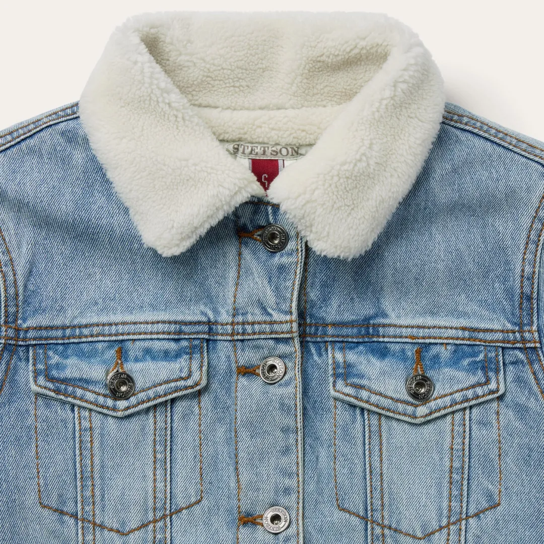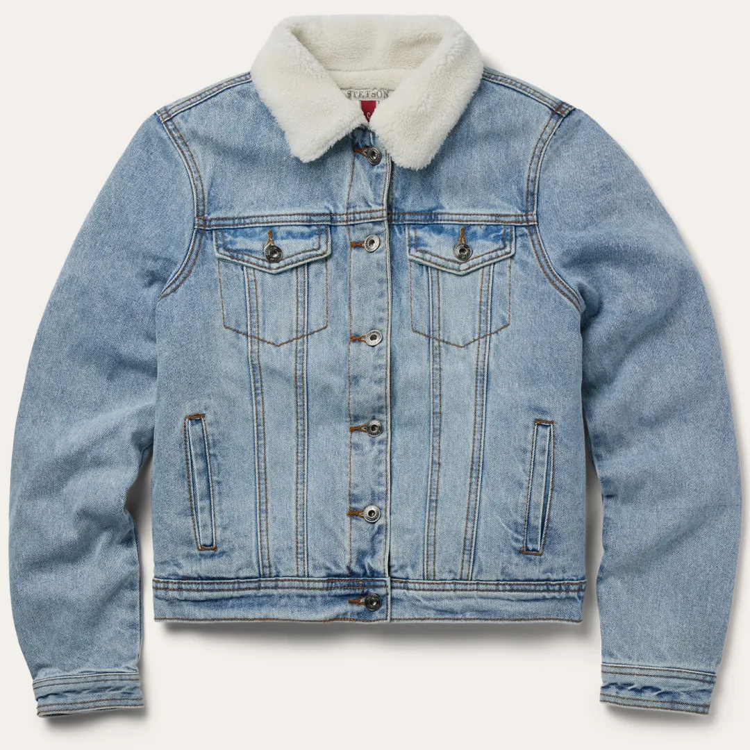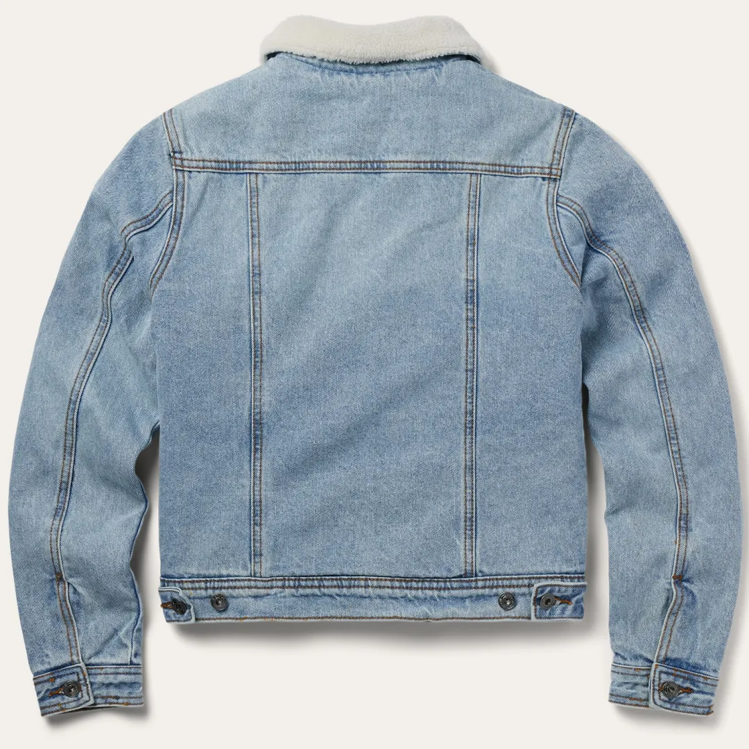 With a sun-faded wash and high-contrast yellow stitching, this sherpa-lined denim jacket provides extra warmth along with classic Western details throughout. It features two front welt pockets, front and back seams, a straight front and back yoke, single-point pockets, flaps and cuffs and back waist tabs. Durable, dependable and always in style, a great denim jacket is the perfect layer for in-between seasons and a go-to for nights on the town.