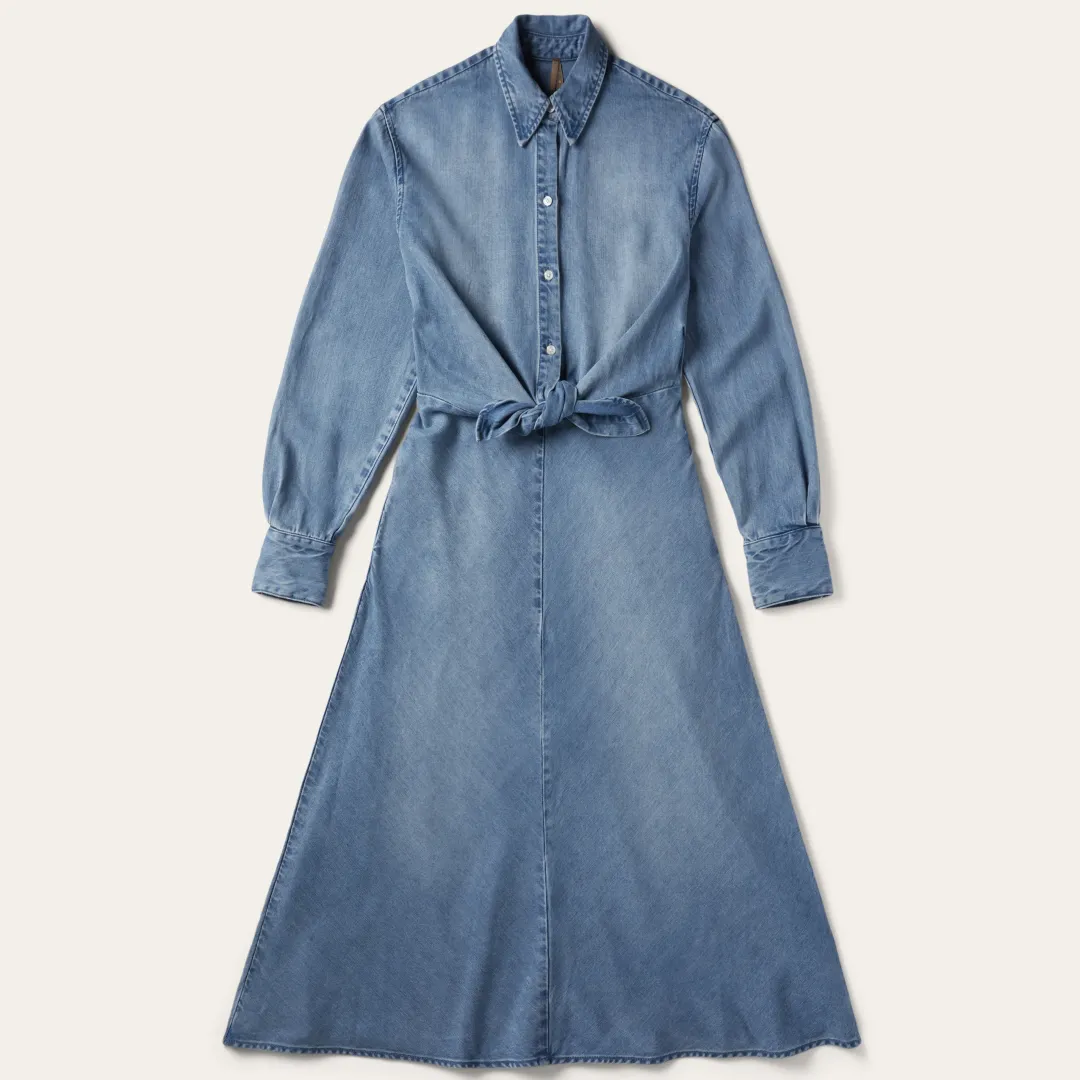 Inspired by your favorite denim shirt, this long-sleeve, mid-length dress features a button-front bodice closure, an elastic back waistline with gathers and a self-tie waist. It has a fold-down collar, pleated and cuffed sleeves and two side seam pockets. Made from sustainable Tencel denim, it pairs equally well with a cowboy hat and boots as it does with a sun hat and sandals.