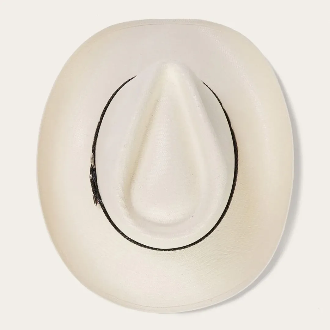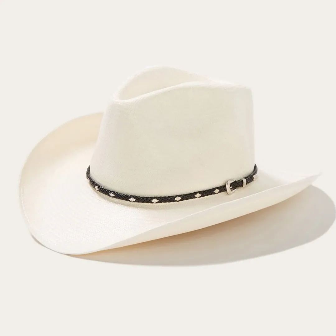 The Diamond Jim 8X Straw Cowboy Hat is constructed of 8X quality straw and features an oval pinchfront crown and a black woven leather hat band with diamond shaped studs and 3-piece buckle accent. 8X Quality Straw. Made in USA.