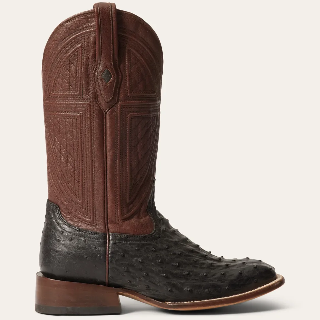 The Dillon Ostrich Boots have a black full ostrich vamp and 13” brown leather vamp. Additional features include premium leather lining, removable Poron insoles, premium brass nails and hand-driven lemonwood pegs that enable the boot to withstand the elements by expanding and contracting with any moisture the boot may encounter.Our exotic western boots are handcrafted with the same care and consideration that goes into our legendary headwear, resulting in the ultimate mix of heel-to-toe comfort, durability, and classic Western style. Their rugged construction is fit for a lifetime of adventure, with high-quality exotic leathers that will develop an attractive patina over time and conform to the wearer, providing years of reliable service.