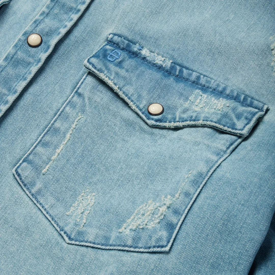 A tried-and-true Western classic in a fitted, modern cut—this is the kind of resilient and dependable shirt you’ll reach for every morning. It’s made from 100% cotton denim that’s been distressed throughout the garment, giving it a lived-in look and features a broken-in feel that only gets better with age. Two snap-closure pockets, a spread collar, and a one-point ultra deep back yoke give this button-down the perfect dose of character.Iconic Western details include Stetson-branded opaque snap buttons on the front placket, cuffs, and pockets, as well as custom embroidery on the chest and right cuff. Exceedingly durable and always comfortable, it’s a rugged essential for all seasons.