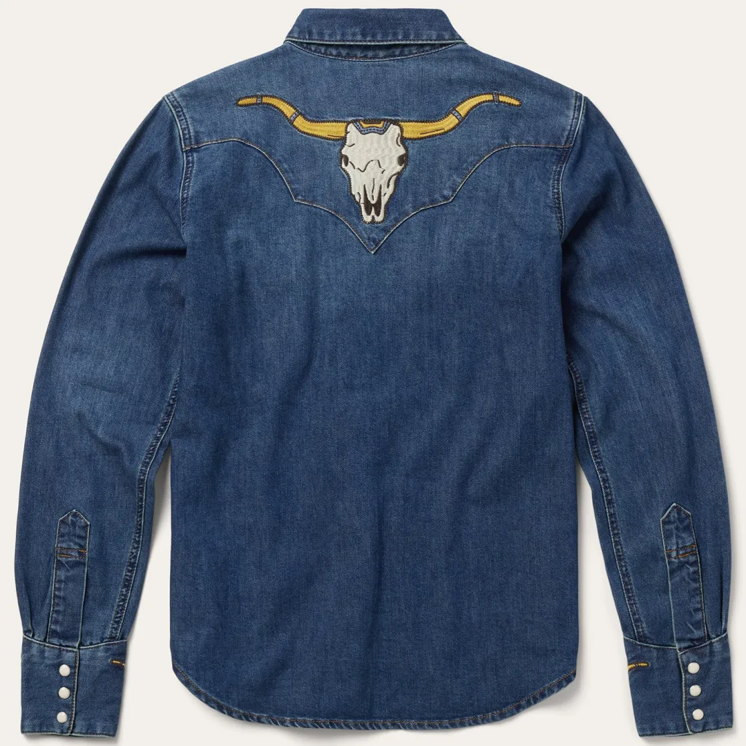 Our snap front shirts for women are crafted for comfort, with flattering fits and stand-out style details. This dark denim shirt wears its western influence proudly on its sleeve—and its front yoke—with a stunning longhorn and horseshoe embroidered design. It has a single point front yoke, a three point back yoke and sawtooth patch pockets with snap closures. Crafted in high-quality, yarn-dyed 100% cotton denim, its fade and feel will only get better with age.