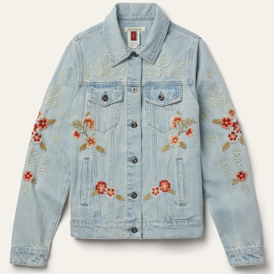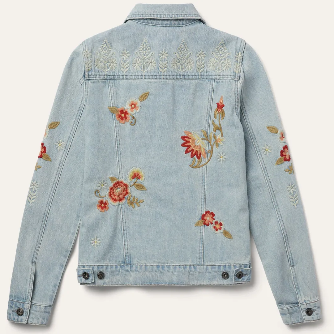 The denim jacket is a true essential, a storied piece of authentic Western outerwear. This version adds flower embroidery for a playful and feminine take on a classic. Finished with authentic details like back waist tabs, flap chest pockets, and metal buttons throughout. Sure to be a favorite throughout the season, and in seasons to come.