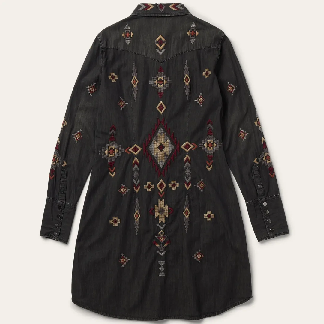 This long sleeve black denim shirt dress is crafted from 100% cotton that has been garment washed for a soft, comfortable feel that will only get better with time. Featuring a stunning all-over embroidered detail, it includes single point front and back yokes, single point front pockets with flaps and snap closures, five snap cuffs and a classic snap front. Its versatile, Western-inspired style can be worn on its own with boots or over a t-shirt and jeans.
