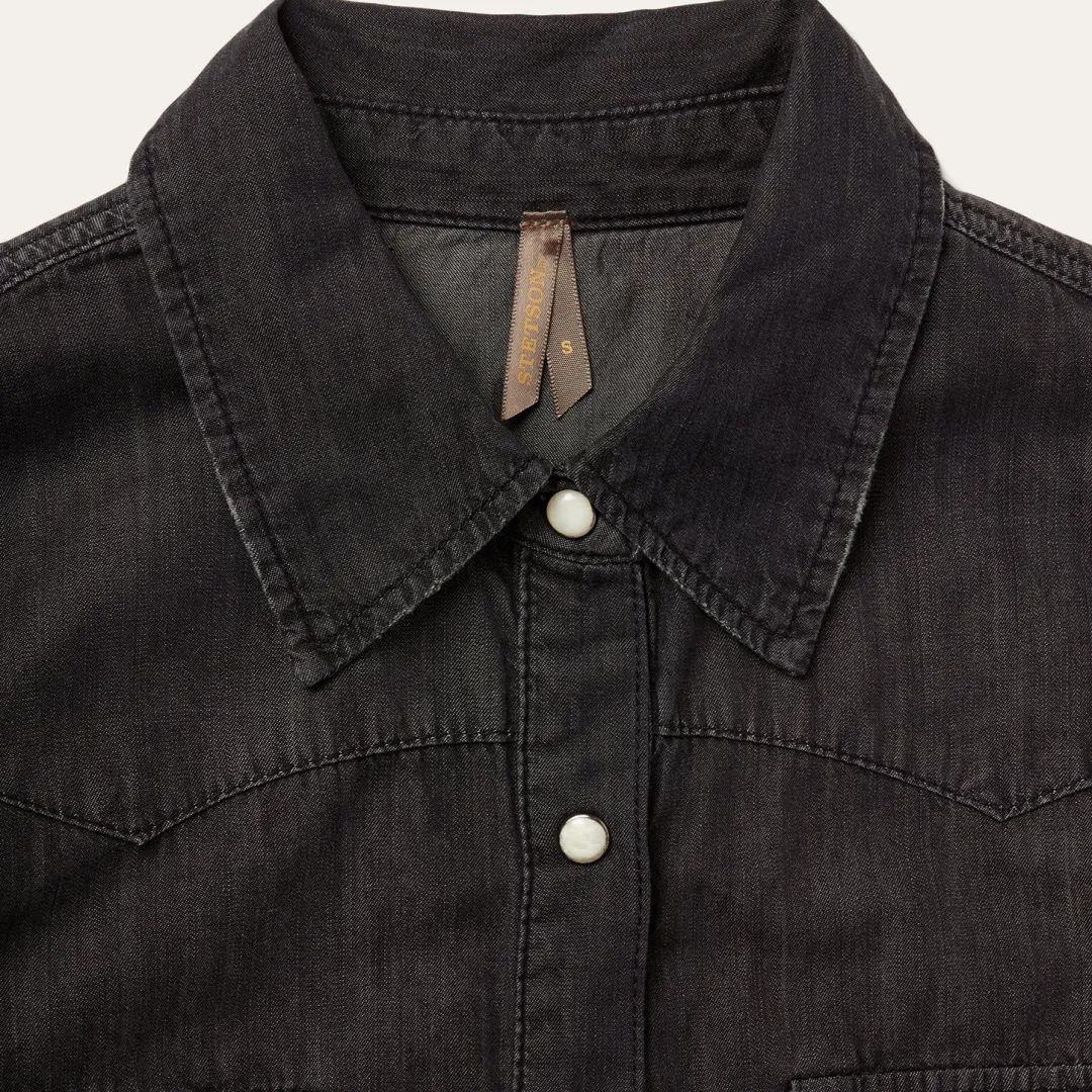 This long sleeve black denim shirt is crafted from 100% cotton that has been garment washed for a soft, comfortable feel that will only get better with time. Featuring a stunning embroidered detail on both sleeves, its Western-inspired style features include curved single point front and back yokes, patch front pockets with flaps and snap closure, three snap cuffs and a classic snap front.