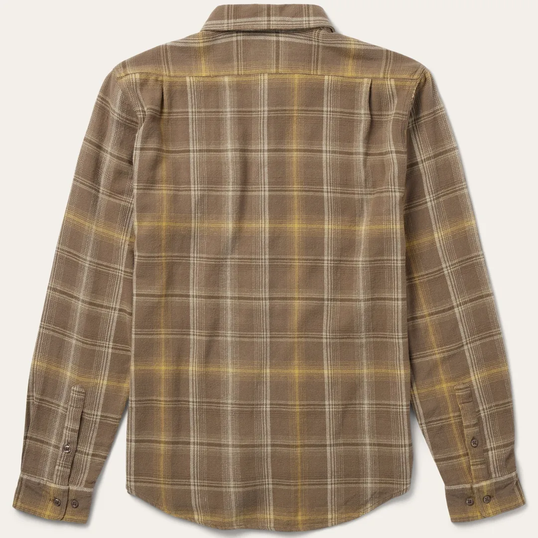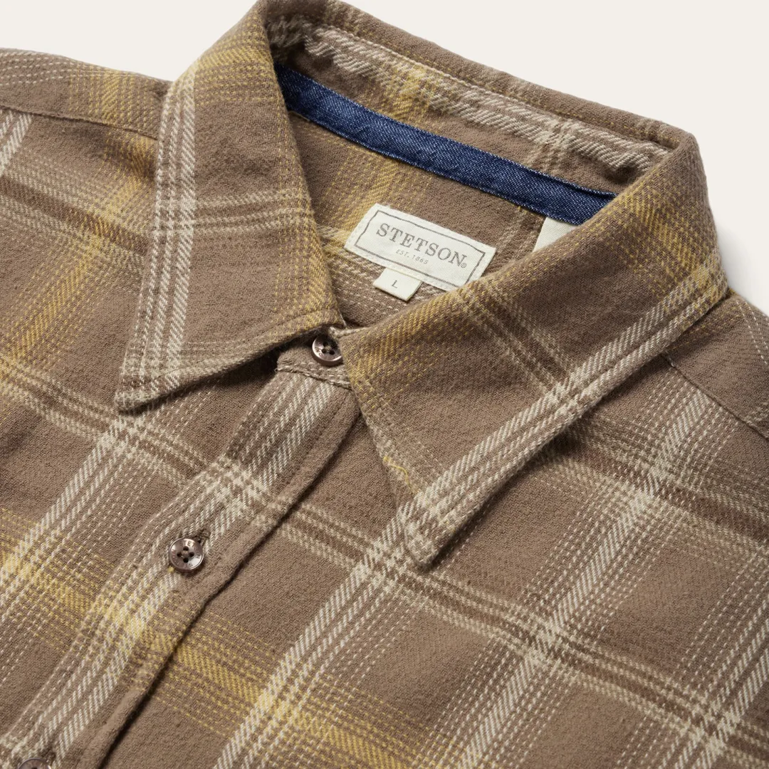 This button-front flannel shirt features an exclusive brown plaid pattern and is crafted from 100% cotton that has been yarn-dyed for rich, lasting color. It has no front yoke, a shallow straight back yoke with pleats, square pockets with flaps and button closures, two-button adjustable cuff, as well as contrast inside denim trim. Cut in our Modern Fit, for a trim, neat appearance that allows for comfort and freedom of movement. Exceedingly durable and always comfortable, our shirts are hard-wearing and built to last.