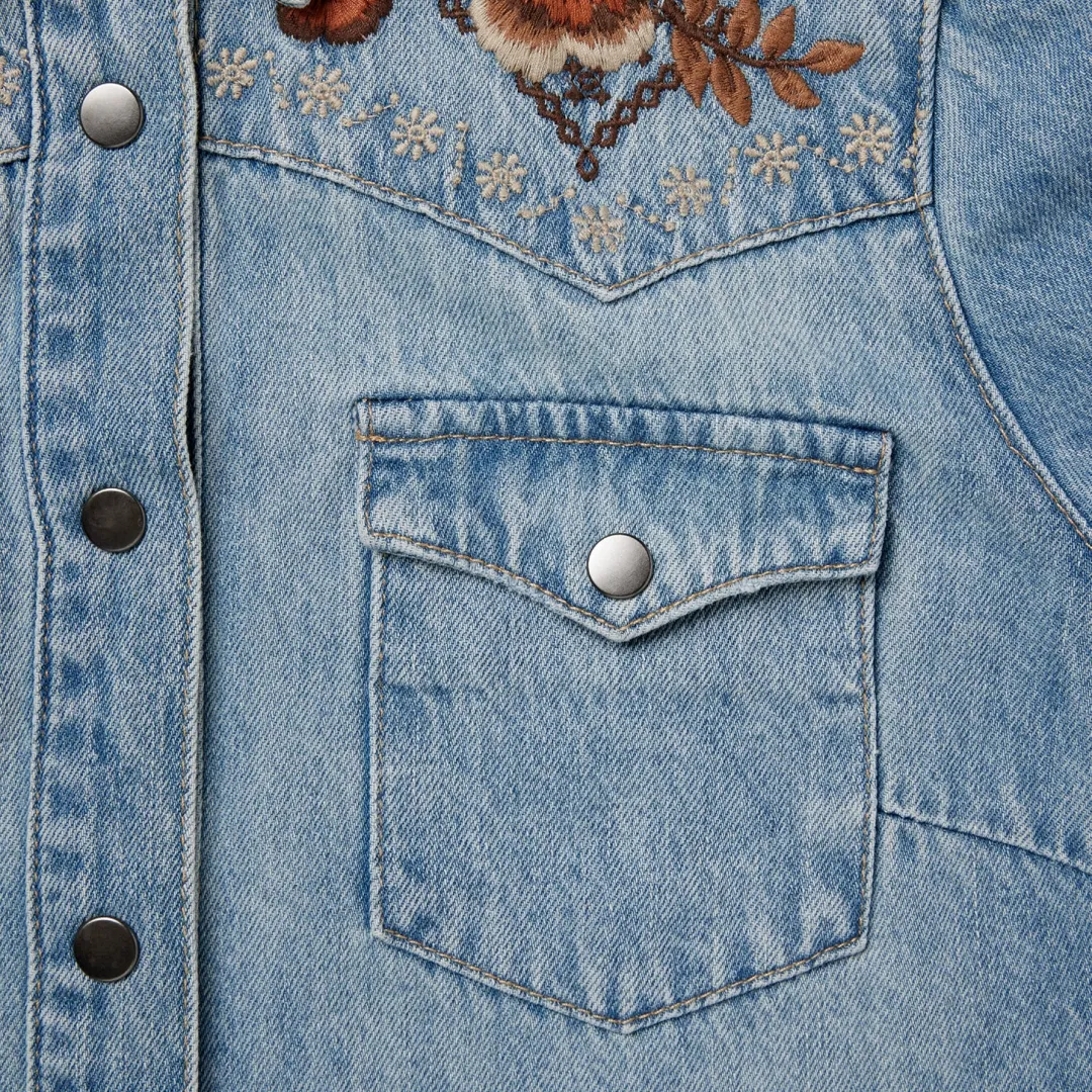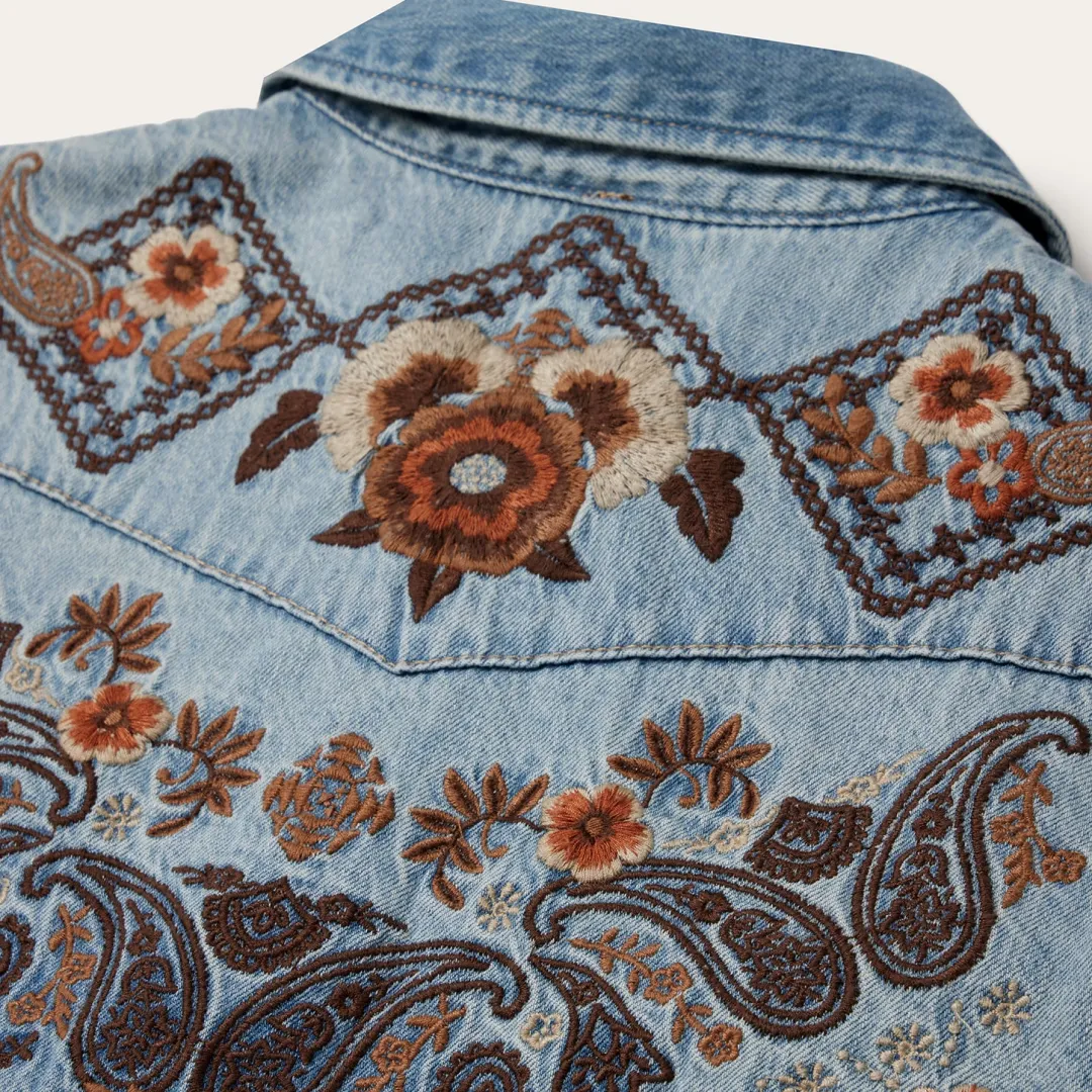 This denim shirt dress features stunning floral paisley embroidery at its front yoke, back and sleeves. Crafted from 100% cotton denim that has been garment washed for extra softness and a lived-in feel, it has western style to spare with a full snap front, single point front and back yokes and single point pockets with flaps and snaps. With a versatile design that can be worn on its own or over jeans, it’s the perfect complement to your favorite pair of boots.