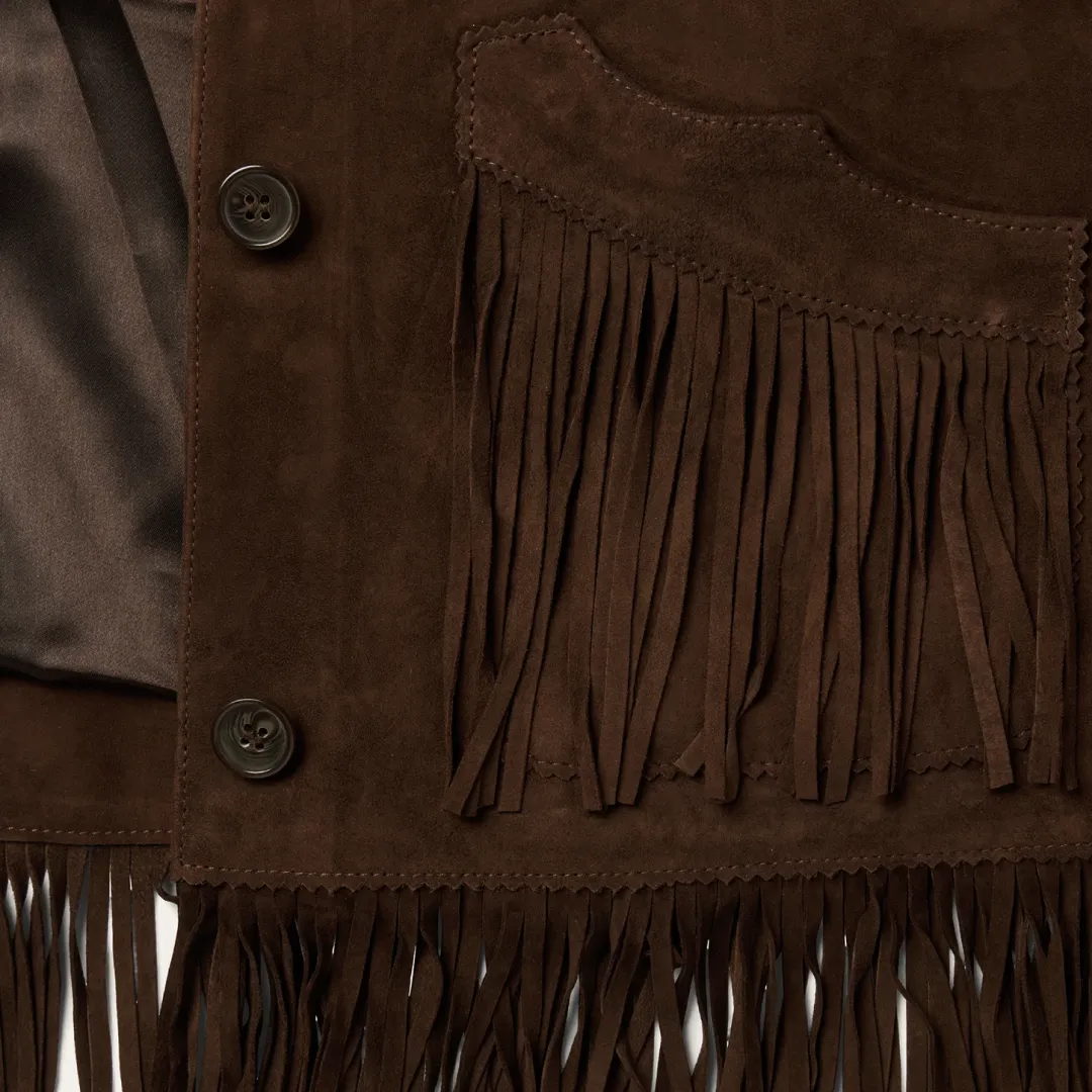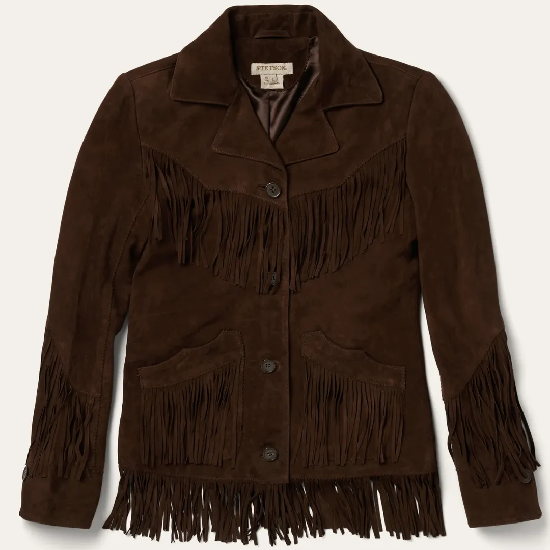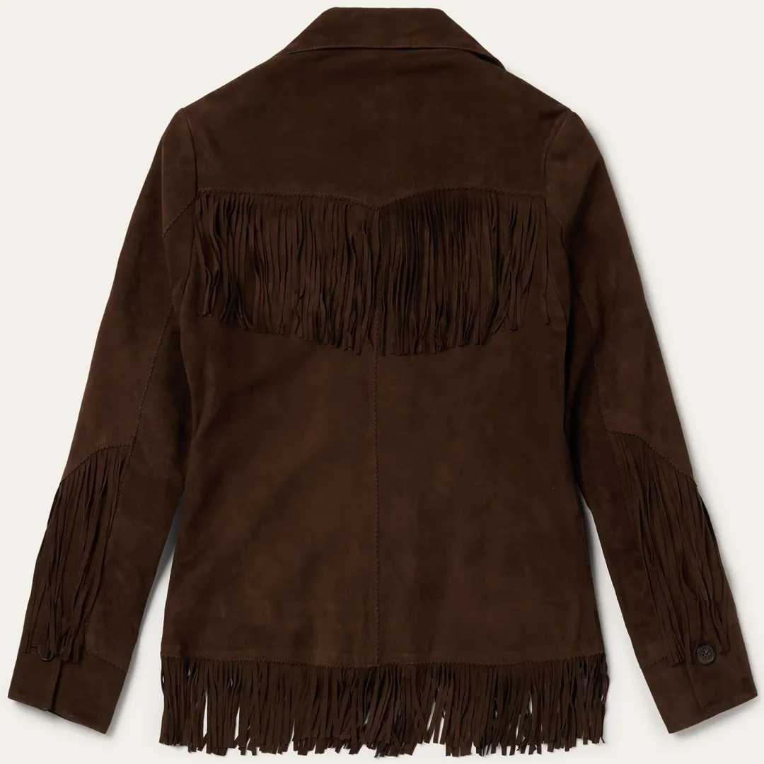 Stand out in this stylish chocolate-colored fringe jacket crafted from high-quality suede leather. Fully lined, it features a notch collar, button front and single point back yoke, but the star of the show is the statement-making fringe that runs along its straight front yokes, front patch pockets and bottom hem. Like all of our women’s outerwear, it’s cut with a flattering fit and made to stand the test of time.