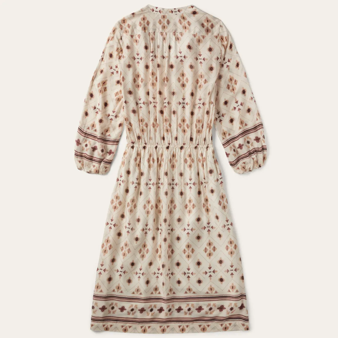 This mid-length zippered dress is woven from 100% rayon herringbone and features an allover, Western-inspired Gaucho Border print. It has 3/4 sleeves with elastic cuffs, a stand collar with a V-neckline, a straight back yoke with gathers below, an elastic waist and side seam pockets.