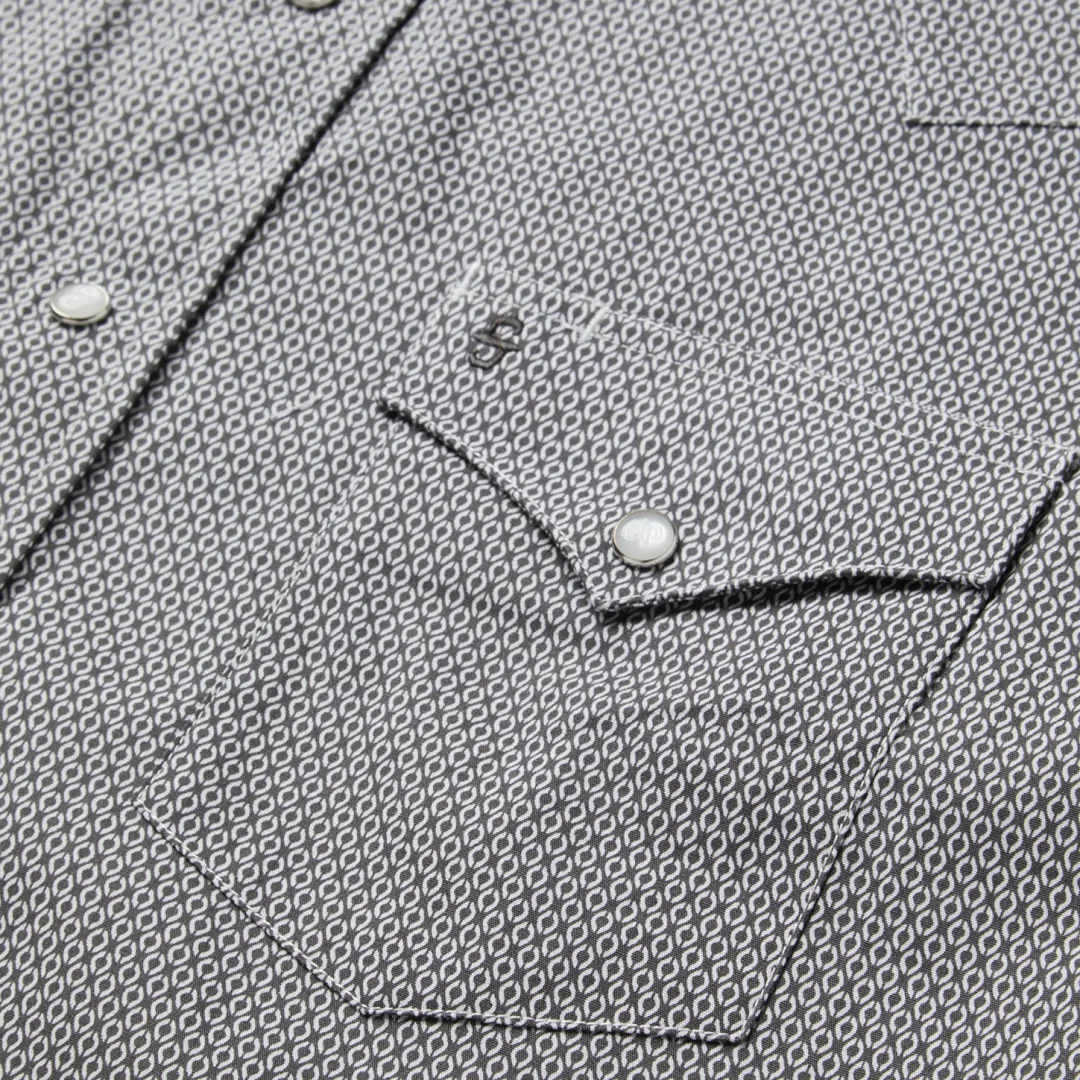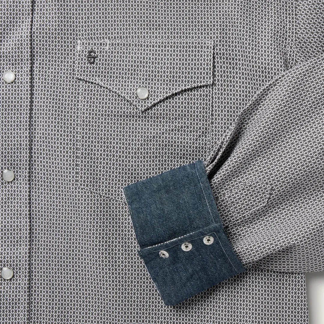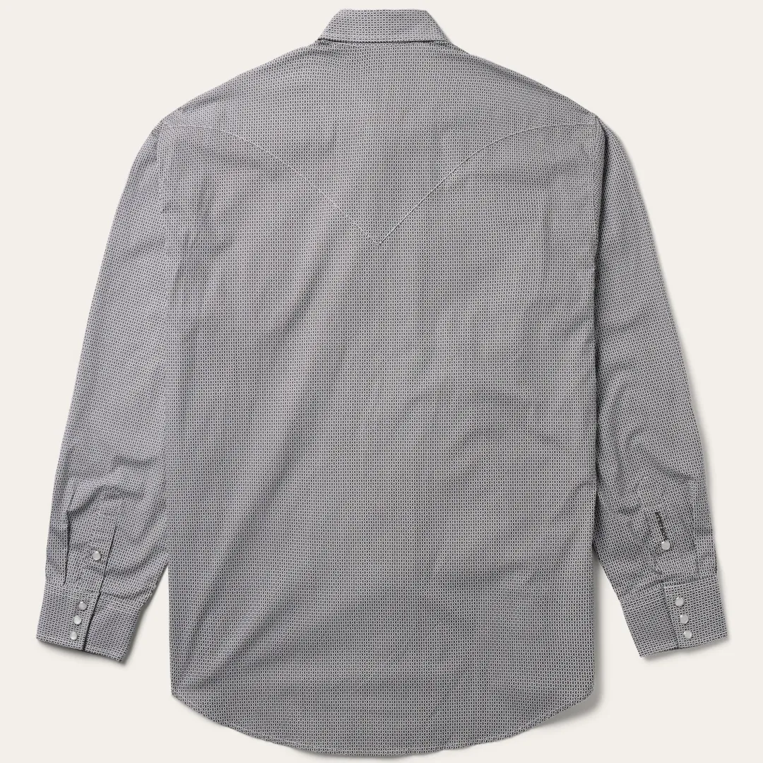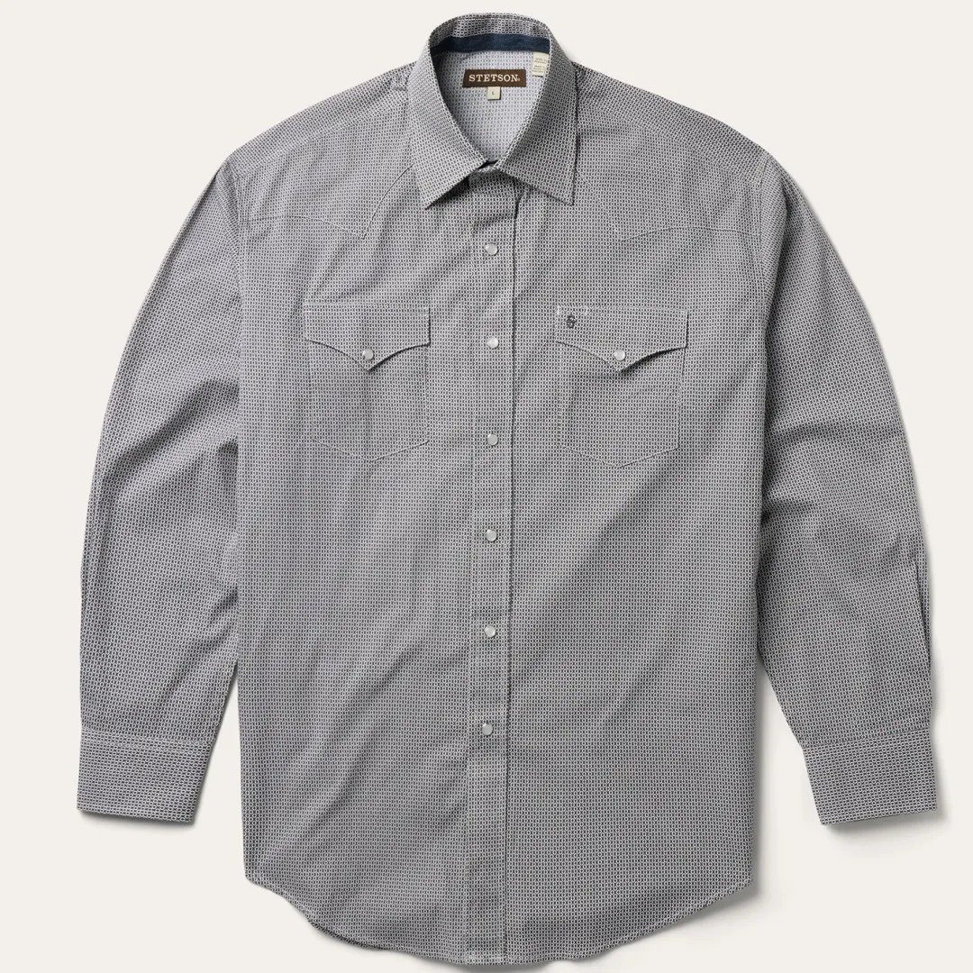 This Western shirt is crafted from a lightweight cotton poplin with a Grey Geo allover print. It features a one-point curved back yoke, logo pearl snap front, and three snap cuffs. The signature Stetson “S” logo is featured on the front left pocket and “STETSON” is embossed on the right sleeve placket. It has a denim strip on the inside collar band and is garment washed for a soft feel that only gets better with age. Cut trim for a modern fit and crafted with 100% cotton for quality and breathability.