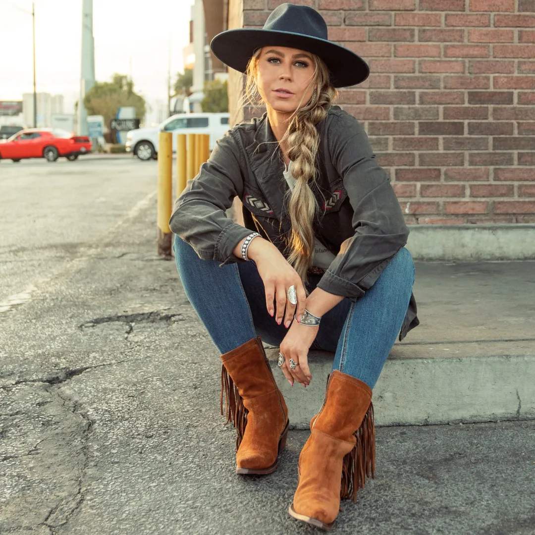 Hit the town with a mix of panache and cowgirl style. Handcrafted by Stetson’s legendary bootmakers from vintage-finished suede. Features include angle fringes, cushioned insoles, premium brass nails and hand-driven lemonwood pegs that enable the boot to withstand the elements by expanding and contracting with any moisture the boot may encounter. Each pair is stitched and tooled by hand to ensure absolute comfort and performance. Frontier-tough, they conform to the wearer over time for years of reliable service. A classic addition to any wardrobe, these boots are a fitting companion for anyone with a strong appreciation for objects that are made well and get better with age.