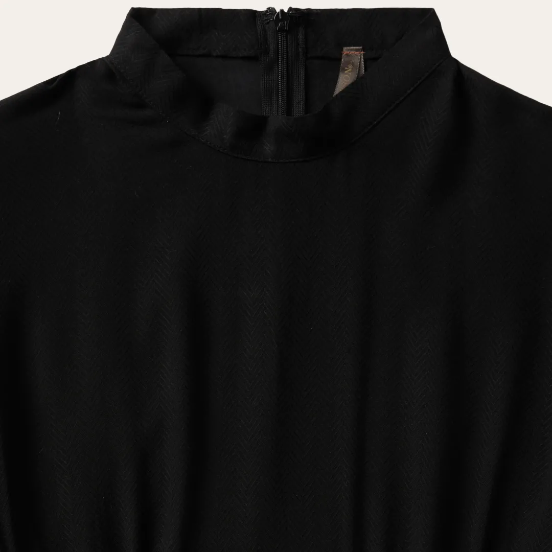 This stylish black midi dress has short sleeves with a slight puff at the shoulder and a stand collar with hook & eye and an invisible zipper closure. It’s gathered at the bust and back darts above a fitted waistband, for a flattering fit. Woven from high-quality rayon herringbone twill that has been yarn-dyed for rich lasting color, it’s crafted for comfort and made for easy movement.