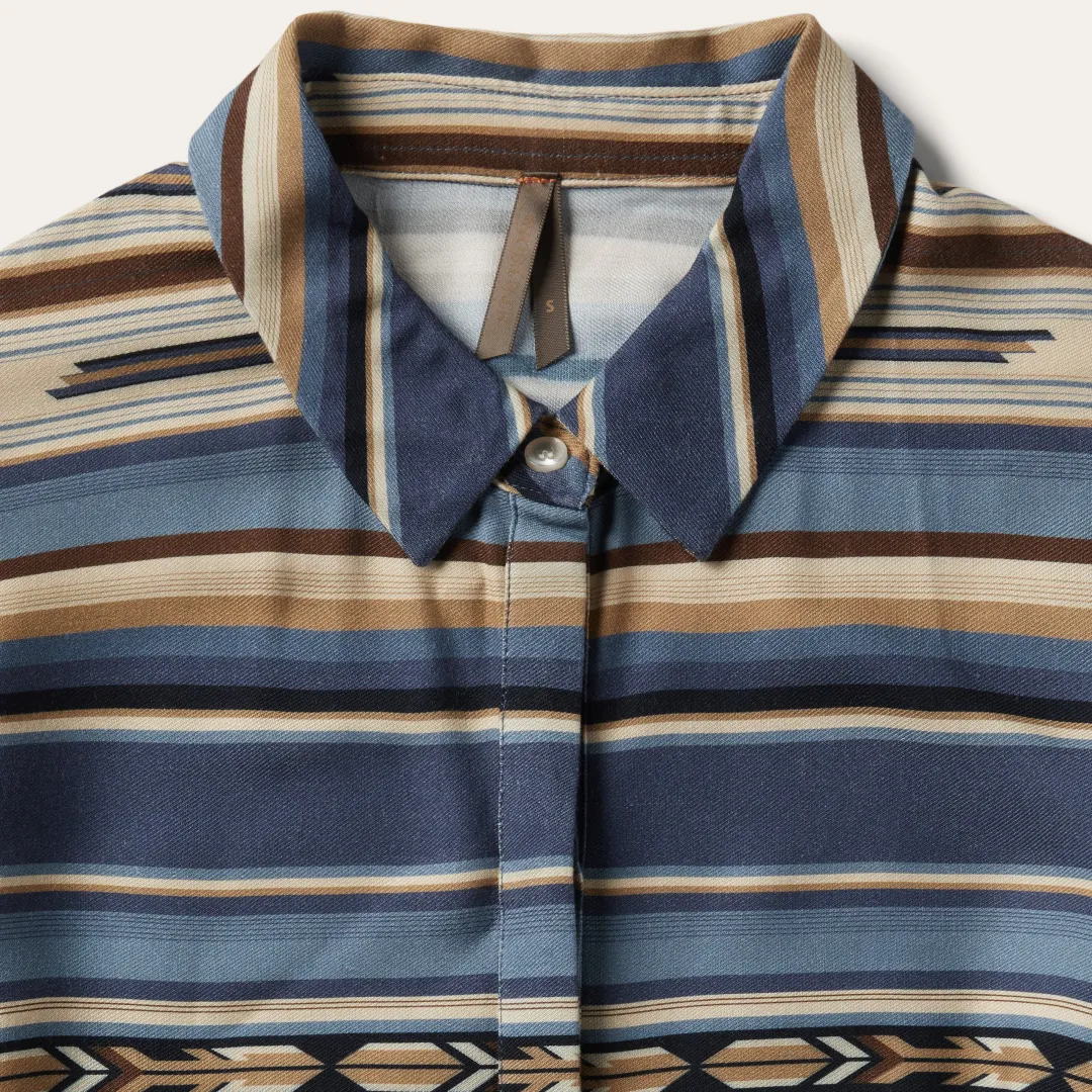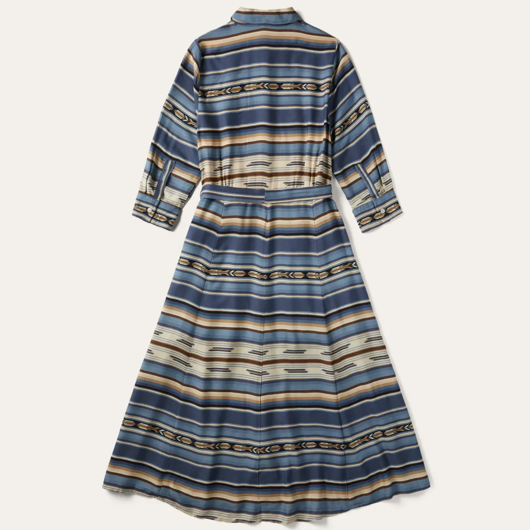 This mid-length dress is woven from 100% rayon twill and features an Indigo Serape print. It has a fold down collar with a full-length hidden button placket closure, elbow-length sleeves with gathers and button cuffs, a fitted waistline with gathers and self fabric tie and a partially lined skirt with side slits.