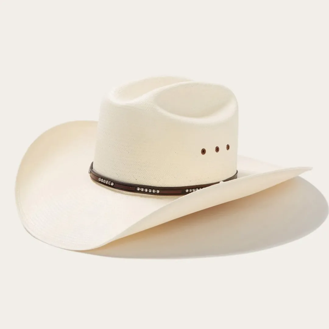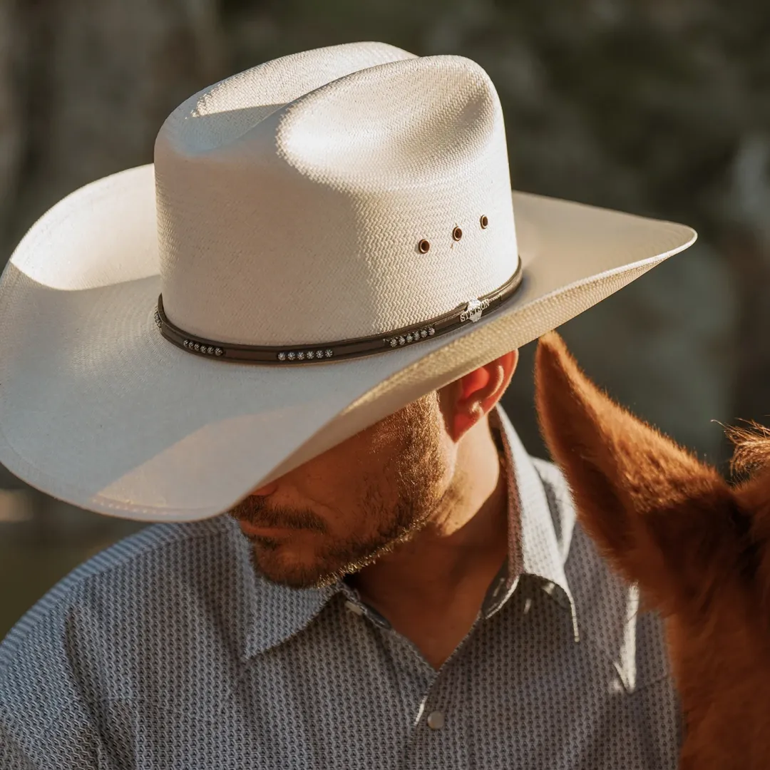 The Llano Shantung Cowboy Hat is constructed of genuine 10X shantung straw and features a dri-lex interior sweatband, studded leather hat band and side vents.