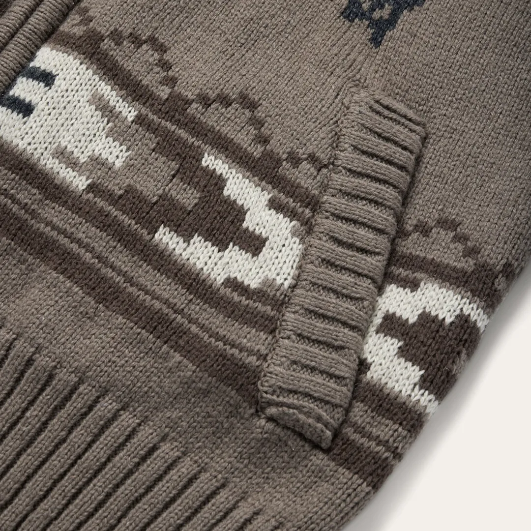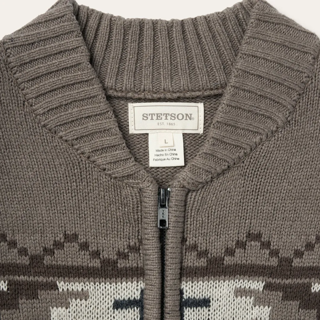 This brown zip-front cardigan sweater gives a nod to Stetson’s long-standing Western heritage with a Longhorn Steer motif alongside an Aztec-inspired print. It has two front hand pockets and a self-knitted collar, cuffs and waistband. Made from a wool blend, it provides warmth, comfort, and rugged style whenever the weather calls for an extra layer.