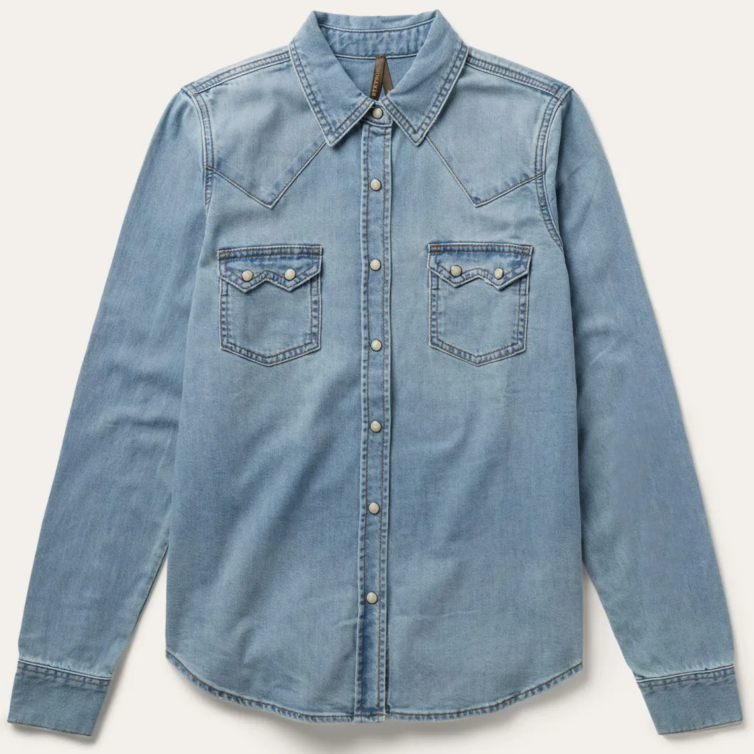 This classic Western-style denim blouse is crafted from 100% cotton and features a loose fit for comfort and freedom of movement. It features two front patch pockets with sawtooth snap closure flaps, deep V single point front yokes and a curved single point back yoke whose seam extends down the sleeves to the cuffs. Additional authentic details include gold contrast top stitching and a shirttail bottom hem.