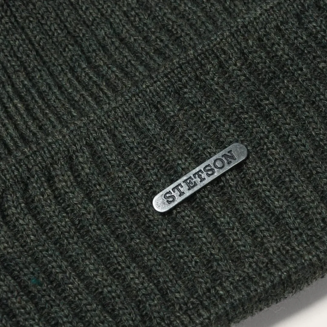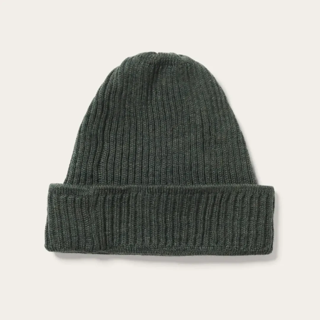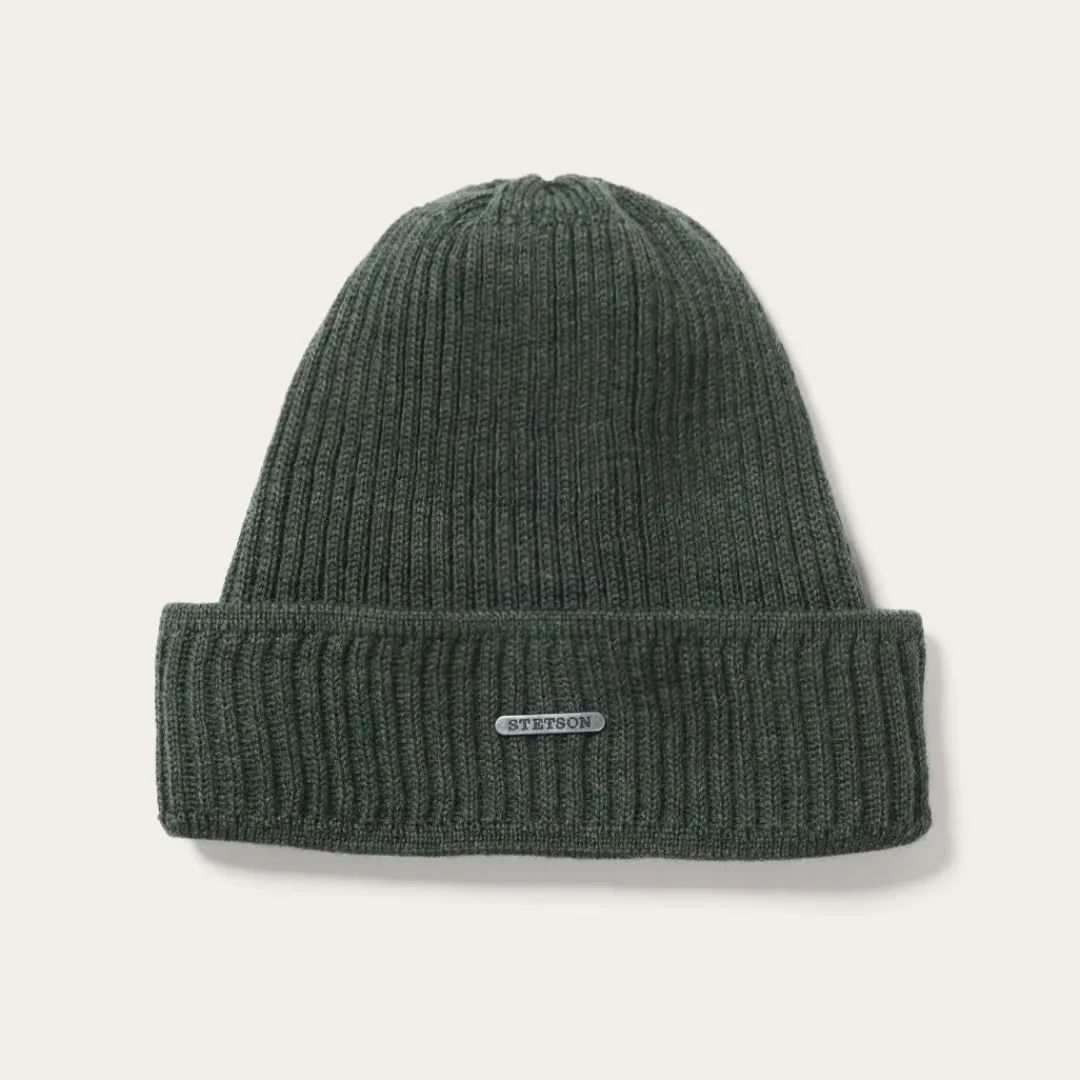 The Merino Wool Ribbed Knit Beanie features a sewn down hem and pullover design.