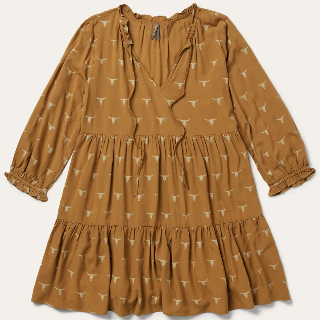 Fit for any cowgirl, this dress wears its Western influence proudly with an exclusive all-over Mojave steer head print. Crafted of high-quality 100% flat rayon, it has a light, airy texture and a flattering fit that allows for freedom of movement. It features 3/4 sleeves with elastic and ruffle cuffs, a ruffle stand collar with self tie closure keyhole neckline and is gathered at the neckline and both skirt tiers.