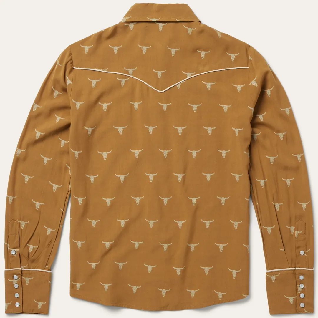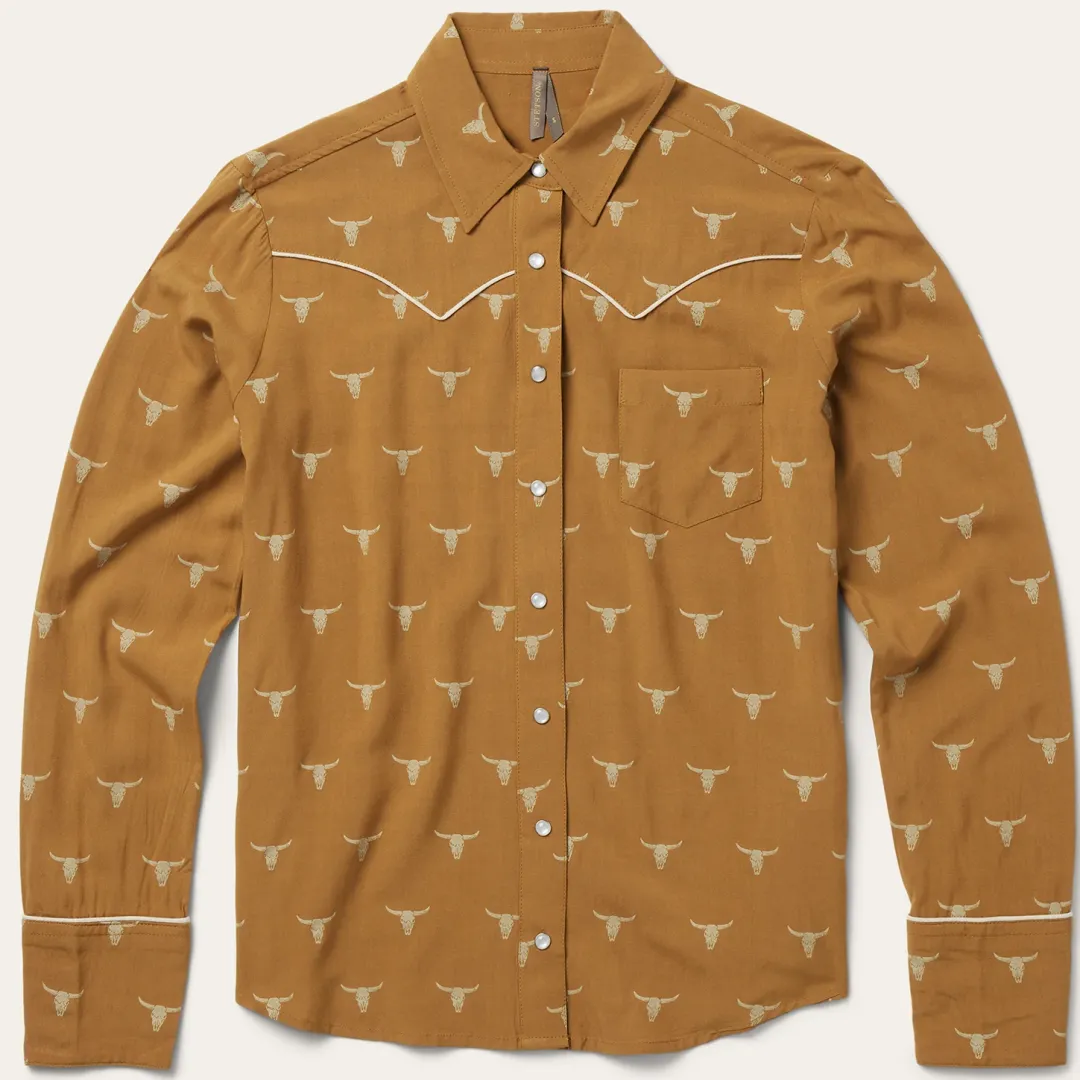 Fit for any cowgirl, this snap front blouse wears its Western influence proudly with an exclusive all-over Mojave steer head print and contrast cream-colored piping at the yokes and cuffs. Crafted of high-quality 100% flat rayon, it has a light, airy texture and a flattering fit that allows for freedom of movement. It features single point, deep curved front and back yokes and a single point left chest patch pocket.