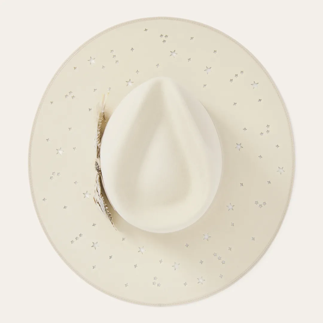 This unique fedora features distinctive star cutouts perforated onto its flat brim that cast a subtle constellation of light wherever you go. Its statement-making style features a 4 ½” teardrop pinch front crown that is finished with a wide grosgrain band, a custom STETSON star pin and removable feather detail. Crafted in high-quality 100% wool with a firm finish, it has a full satin liner and genuine leather sweatband to ensure a comfortable and secure fit. Part of our Seeker Collection, it’s made for those with a wandering, frontier spirit and a fitful reminder to always follow the stars.
