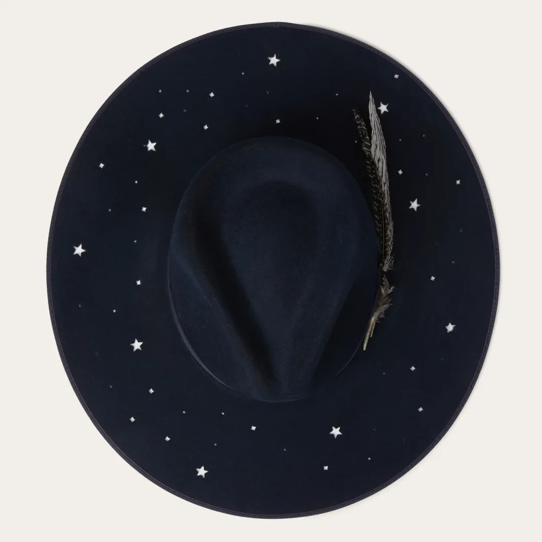 This unique hat features distinctive star cutouts on its wide, flat brim, along with both a feather and a custom Stetson Star Pin on the grosgrain hat band. This hat is crafted with firm felt, and a high-quality leather sweatband at the interior.