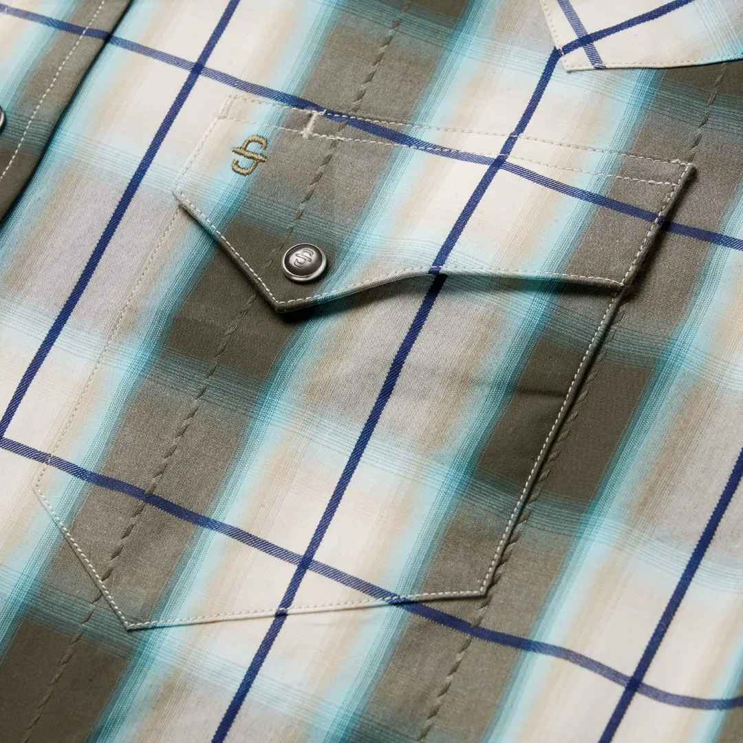 This snap front western shirt is crafted from 100% cotton and features a yarn-dyed olive ombre plaid with dobby stitch. It has asymmetrical snap-closure pockets with flaps, a spread collar,contrast denim inside trim and a one point back yoke.