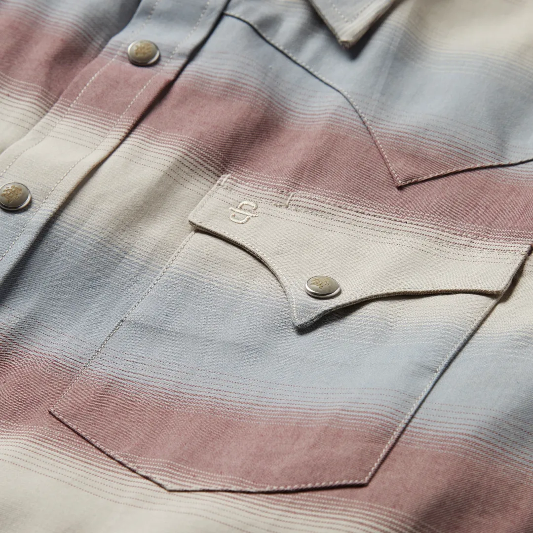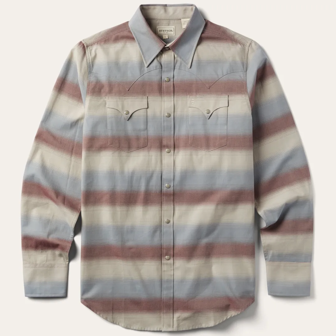 This Western-style shirt features our exclusive Ombre Stripe print and has a trim, modern fit. Authentic details include a one-point, ultra-deep back yoke, two front pockets, with one-point pocket flaps and three-snap cuffs. Subtly embossed Stetson logos on the chest pocket and sleeve placket along with striking interior paisley contrast trim add further style. Made from a sturdy 100% brushed twill cotton that hangs well while keeping its shape and only gets better with age.