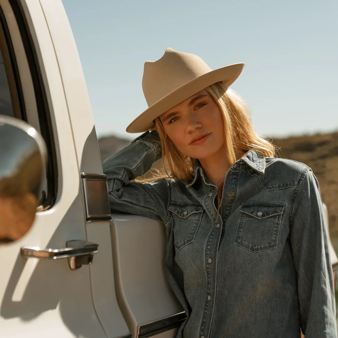 Handcrafted in the U.S.A., the most popular version of the iconic Open Road represents the ultimate mix of Western heritage and modern versatility. A proprietary fur-felt blend gives the Open Road 6X a substantial feel and stiffness, which offers a more secure fit and helps it retain its shape come rain or shine. With its western-style crown and 2 ¾” bound-edge brim, the Open Road 6X easily transitions from country to city, and looks equally sharp on a woman or a man.
