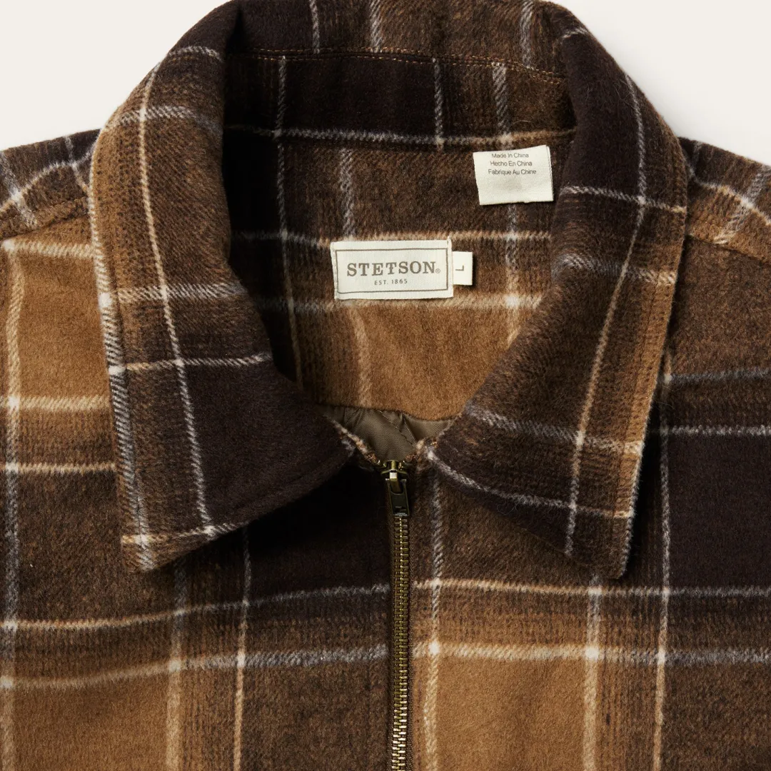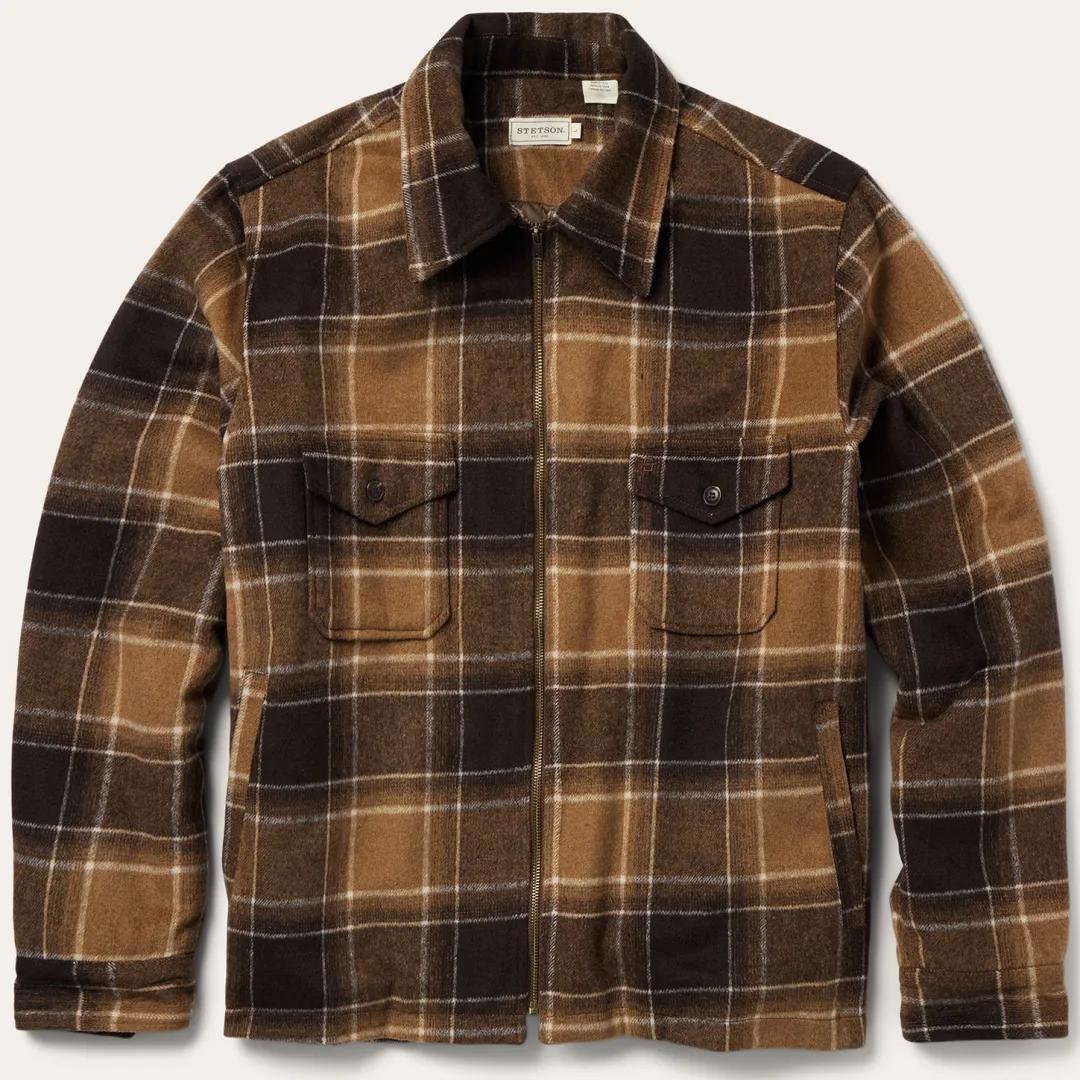 Rugged, durable and stylish, this brown plaid coat is crafted from a comfortable poly-wool blend and is fully lined with quilted nylon for additional warmth. It has a spread collar, a straight back yoke, square mitered chest pockets with one point flaps and button closure, inset hand pockets a two-button adjustable cuff and a zip front. At Stetson, we’ve been outfitting men who venture into cold, weather-worn territories since 1865 — this is quality you can rely on.