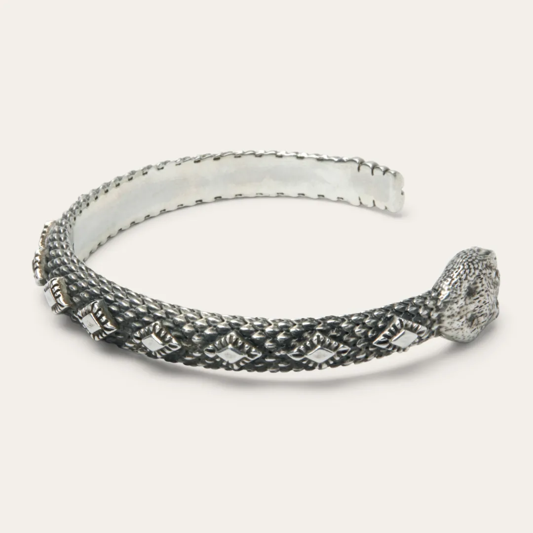 Rattlesnakes have always played an important part of the mythology of the Southwest. Although deadly, the rattlesnake was also thought to have healing properties and was considered a spirit animal. A diamond shaped pattern elevates the design of this sterling silver Rattlesnake Cuff. A perfect wrist accessory, the cuff can be worn on its own, or layered with other pieces for a timeless, Americana-inspired look.