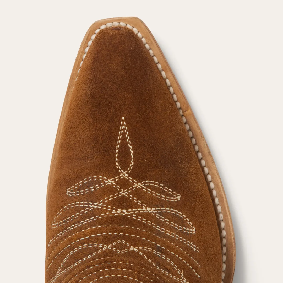 The Reed Western Mules have a brown suede upper and feature a snip toe with unique toe bug embroidery. Additional details include a stacked heel, cushioned leather insoles, premium brass nails and hand-driven lemonwood pegs that enable the boot to withstand the elements by expanding and contracting with any moisture the boot may encounter.Our western boots are handcrafted with the same care and consideration that goes into our legendary headwear, resulting in the ultimate mix of heel-to-toe comfort, durability, and classic Western style. Their rugged construction is fit for a lifetime of adventure, with high-quality leathers that will develop an attractive patina over time and conform to the wearer, providing years of reliable service.