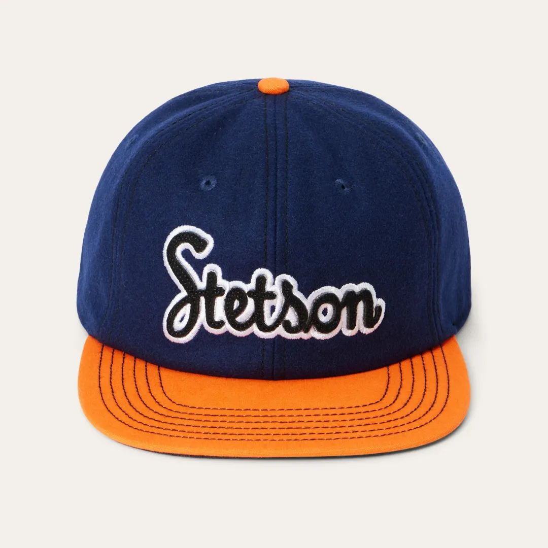 This vintage-inspired navy blue baseball cap is crafted from a rich wool blend and features a STETSON logo in distinctive retro script and has a contrasting orange flat brim and top button.. It has a soft, unstructured crown and an adjustable strap back closure.